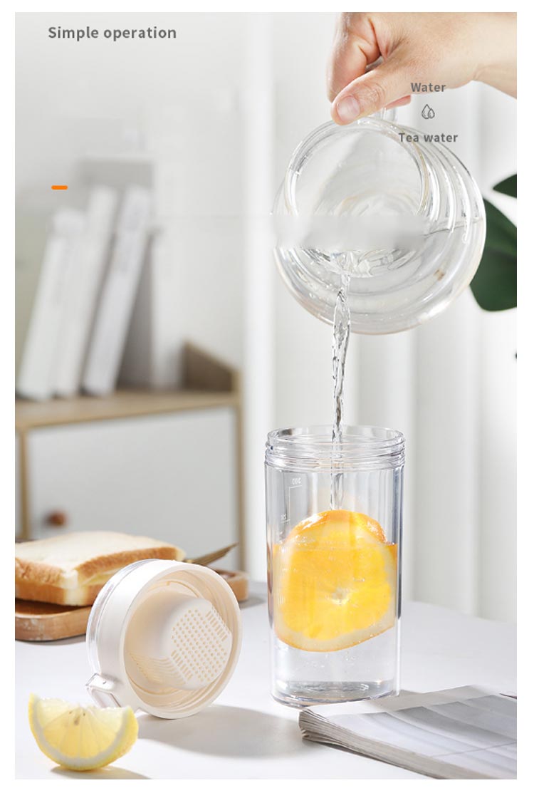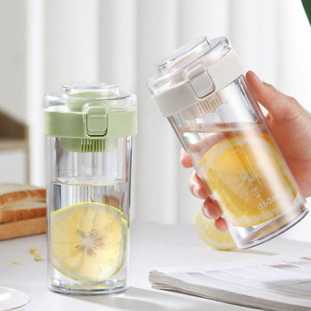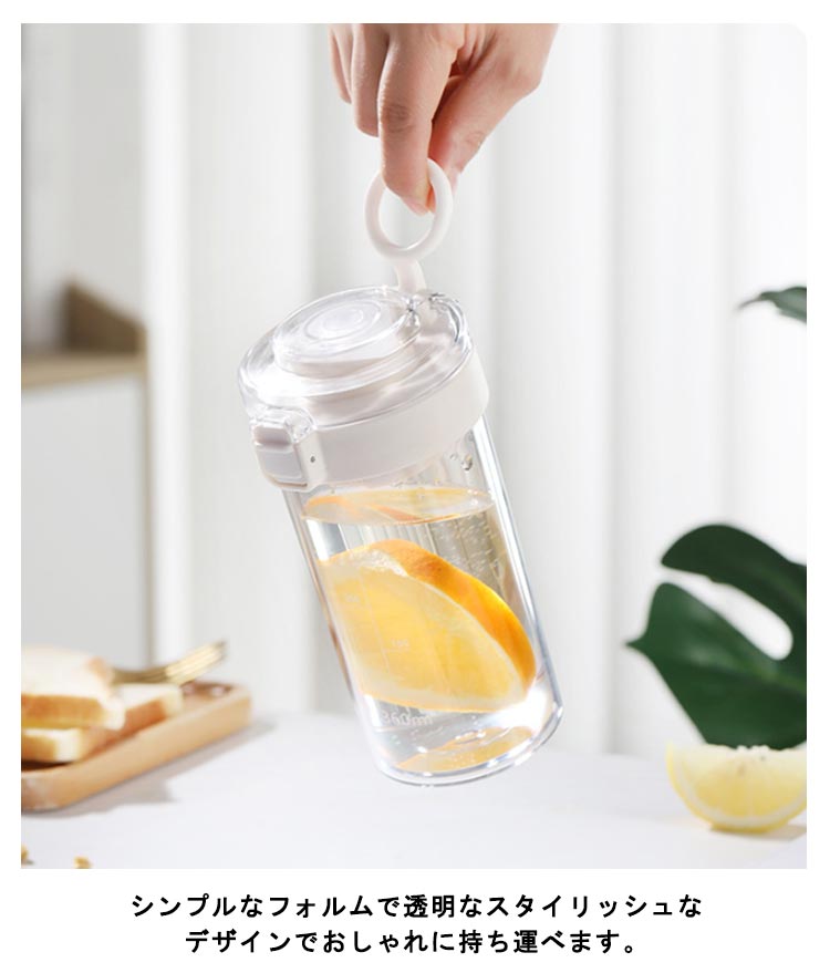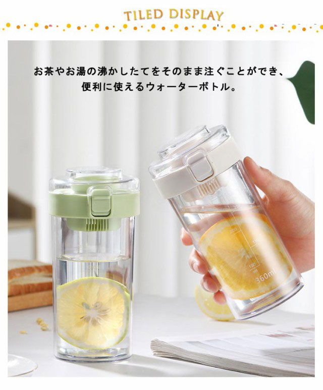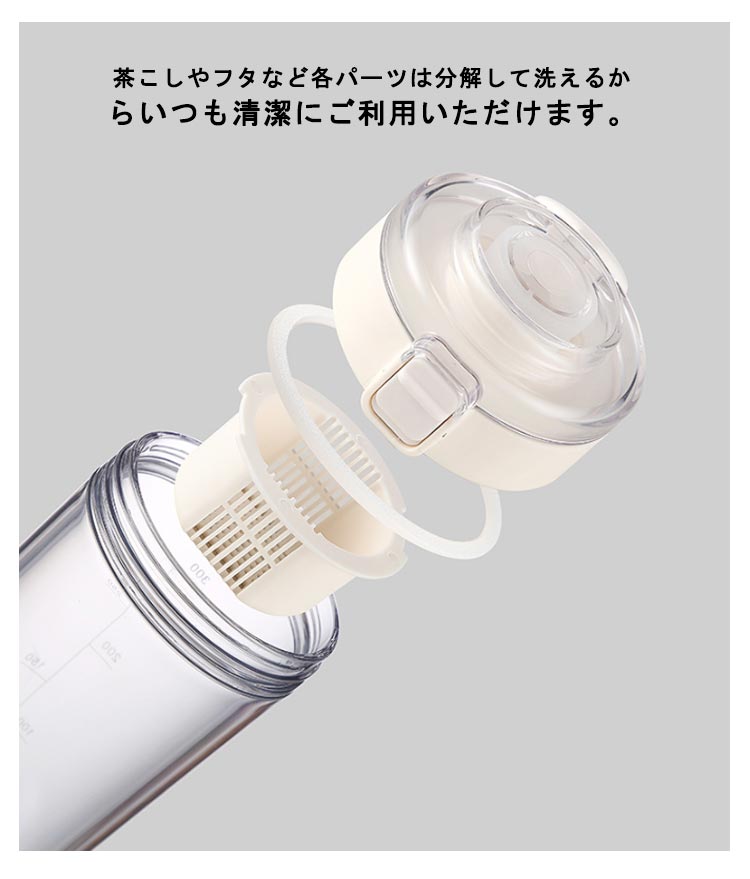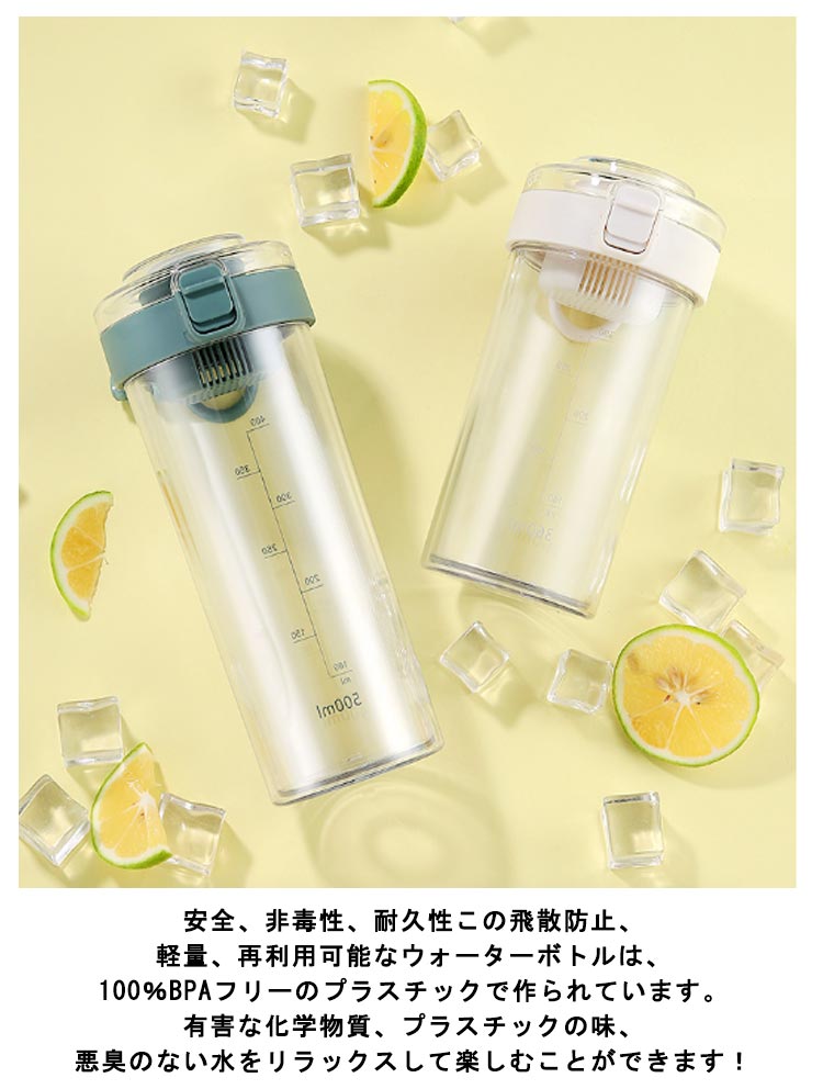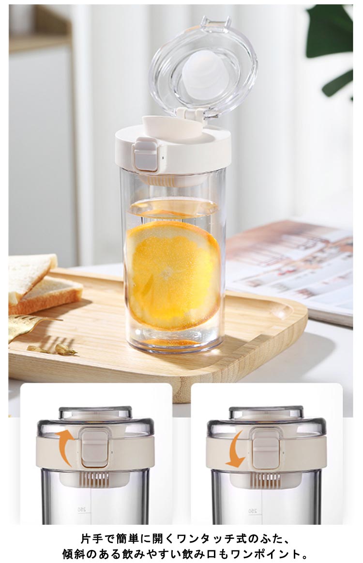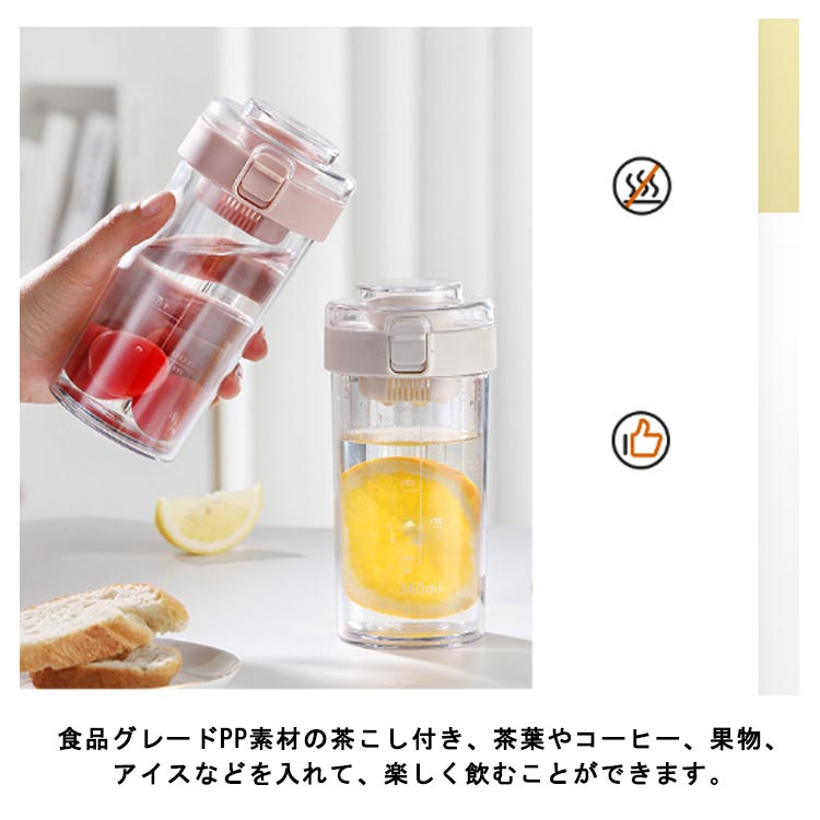 お茶やお湯の沸かしたてをそのまま注ぐことができ、便利に使えるウォーターボトル。片手で簡単に開くワンタッチ式のふた、傾斜のある飲みやすい飲み口もワンポイント。安全、非毒性、耐久性この飛散防止、軽量、再利用可能なウォーターボトルは、100%BPAフリーのプラスチックで作られています。有害な化学物質、プラスチックの味、悪臭のない水をリラックスして楽しむことができます!シンプルなフォルムで透明なスタイリッシュなデザインでおしゃれに持ち運べます。食品グレードPP素材の茶こし付き、茶葉やコーヒー、果物、アイスなどを入れて、楽しく飲むことができます。茶こしやフタなど各パーツは分解して洗えるからいつも清潔にご利用いただけます。