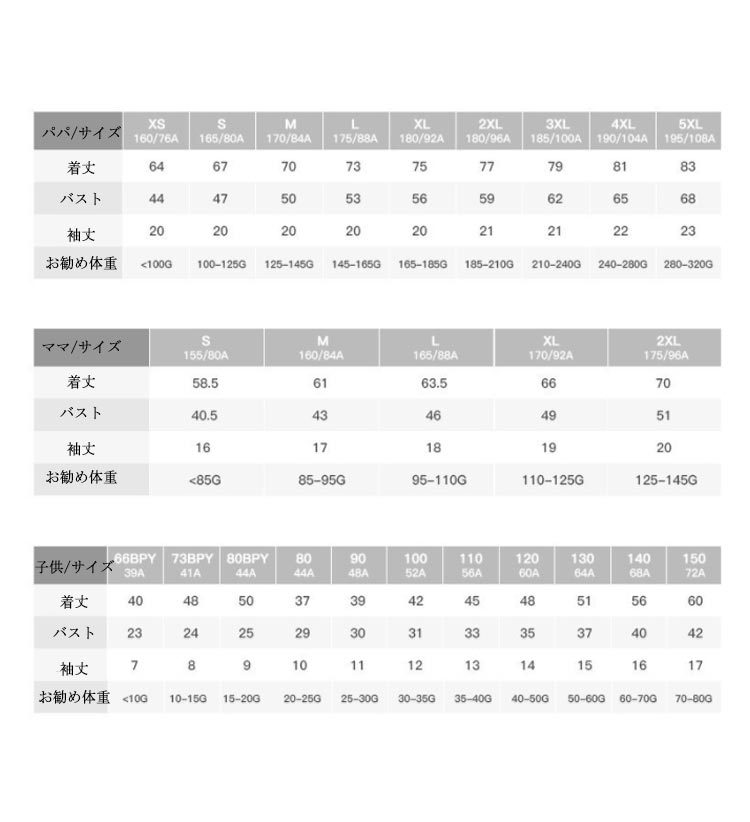 | サイズ | ロンパース66cm ロンパース73cm ロンパース80cm Tシャツ80cm Tシャツ90cm Tシャツ100cm Tシャツ110cm Tシャツ120cm Tシャツ130cm ママS ママM ママL ママXL ママ2XL パパXS パパS パパM パパL パパXL パパ2XL |