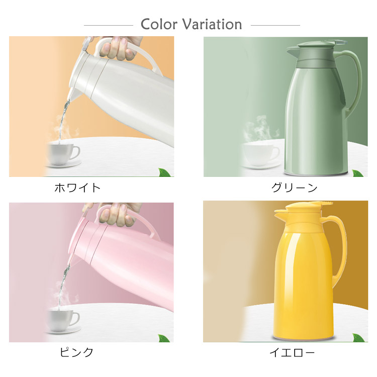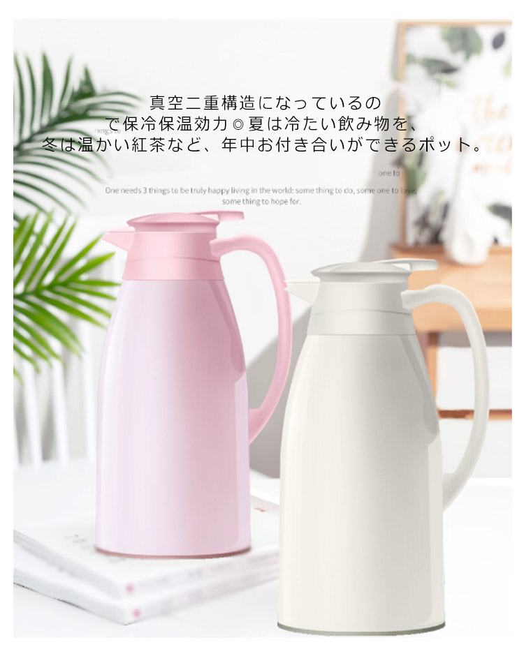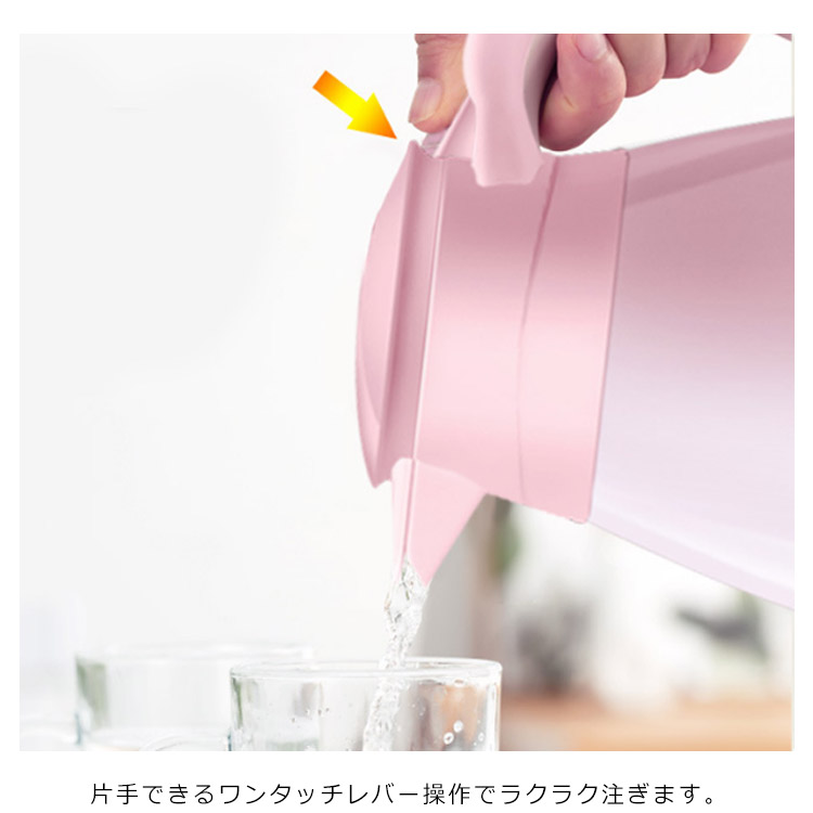 | おうち時間を楽しむ保温ポット。まほうびん構造だから電気を使わず、保温?保冷で1年中大活躍。容量は1.9Lなので、みんなでついでも継ぎ足しに行く必要がないので便利です。 真空二重構造になっているので保冷保温効力◎夏は冷たい飲み物を、冬は温かい紅茶など、年中お付き合いができるポット。 片手できるワンタッチレバー操作でラクラク注ぎます。 底部は滑り止めデザインで安定感アップ! 毎日のお食事用から、部活動、ピクニックやパーティーなど屋内外の様々なシーンで大活躍してくれます。 | |