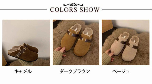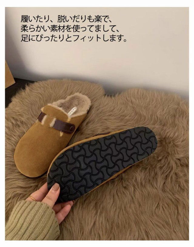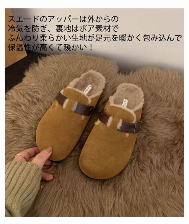 | かかとがないのでいつでもサッと履ける便利なサボサンダル。 スエードのアッパーは外からの冷気を防ぎ、裏地はボア素材でふんわり柔らかい生地が足元を暖かく包み込んで保温性が高くて暖かい! どんなスタイルにも合わせやすくカジュアルはもちろん、オフィスでも使いやすいデザインです。 履いたり、脱いだりも楽で、柔らかい素材を使ってまして、足にぴったりとフィットします。 ちょっとしたお出かけにサッと履いて出かけられて、デイリーユースにも大活躍? | |