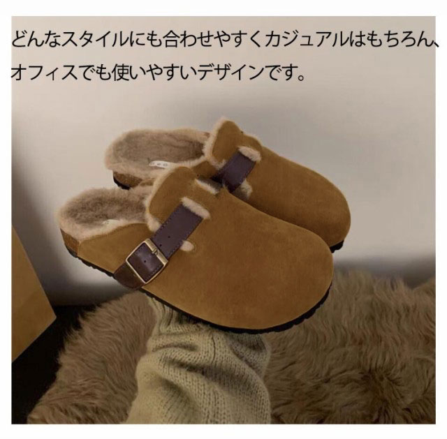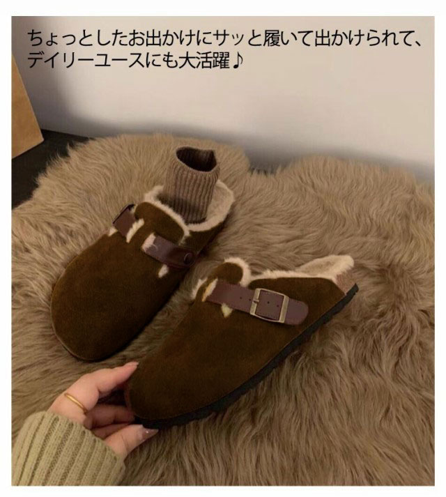 かかとがないのでいつでもサッと履ける便利なサボサンダル。スエードのアッパーは外からの冷気を防ぎ、裏地はボア素材でふんわり柔らかい生地が足元を暖かく包み込んで保温性が高くて暖かい!どんなスタイルにも合わせやすくカジュアルはもちろん、オフィスでも使いやすいデザインです。履いたり、脱いだりも楽で、柔らかい素材を使ってまして、足にぴったりとフィットします。ちょっとしたお出かけにサッと履いて出かけられて、デイリーユースにも大活躍♪