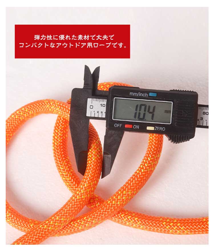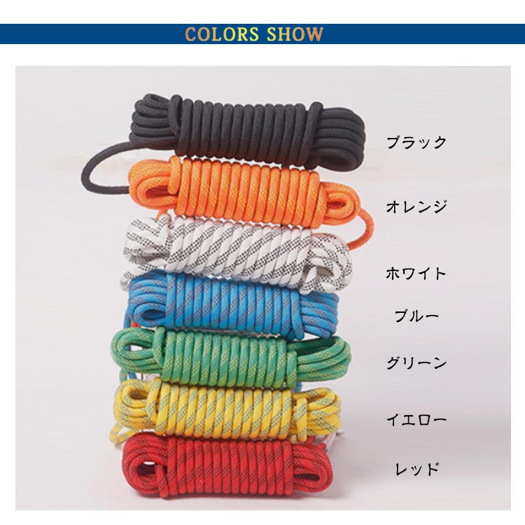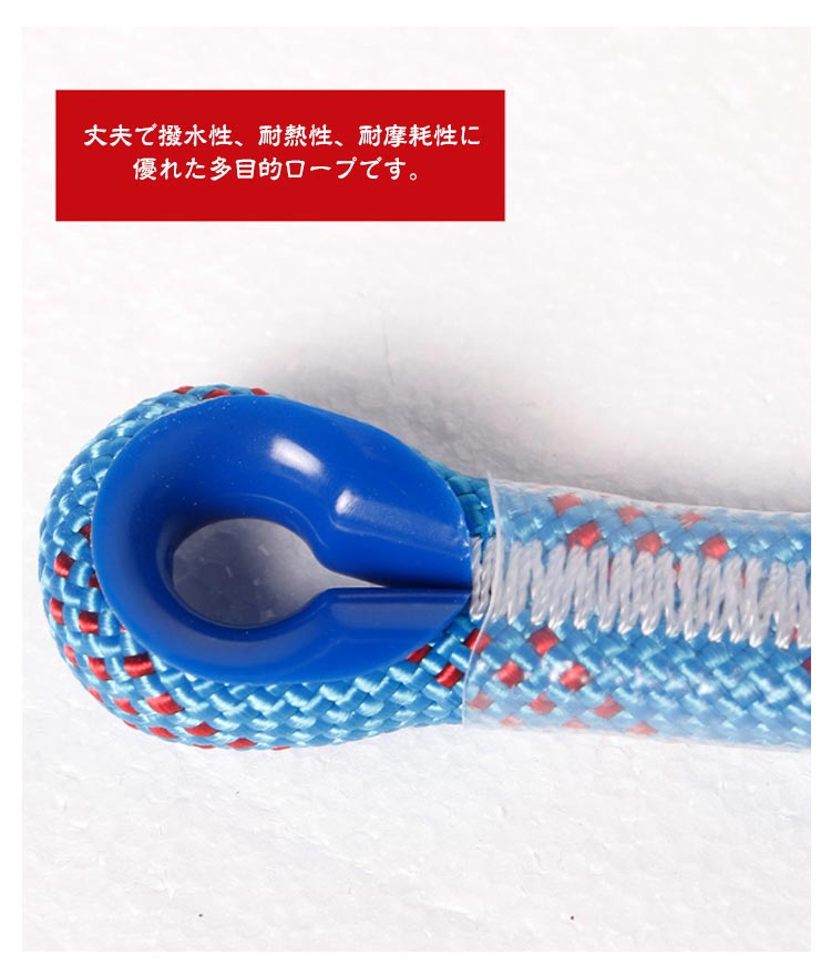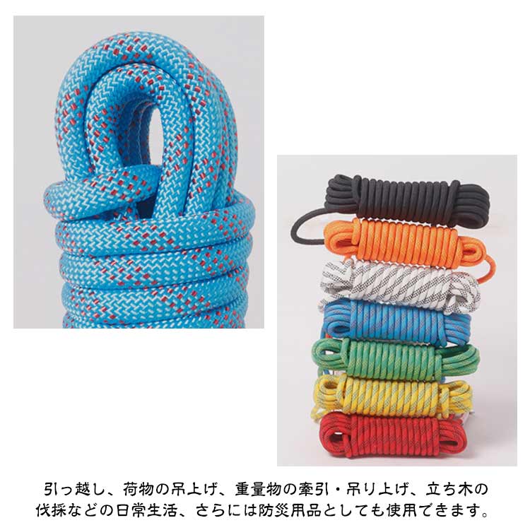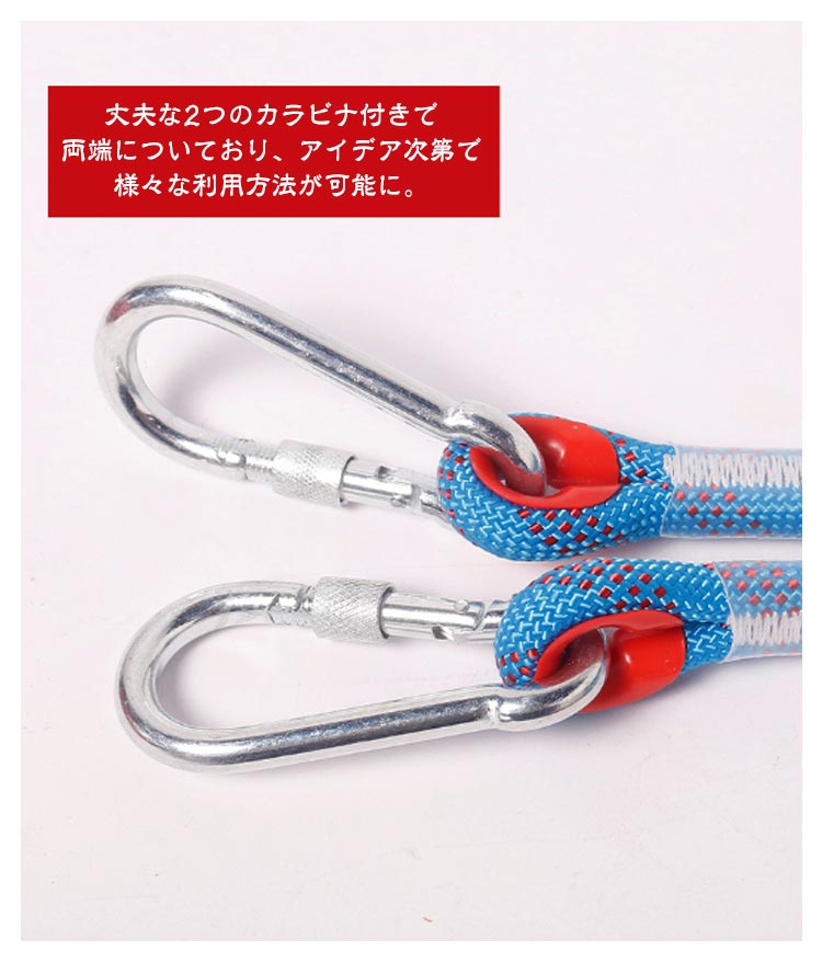 【10M 15M 20M】【多用途ロープ】【8mm 10mm】登山、ボルダリング、荷物の吊り上げなど様々な用途にご使用になれます。弾力性に優れた素材で丈夫でコンパクトなアウトドア用ロープです。アウトドア、高所作業、災害時等マルチなシーンで活躍します!丈夫で撥水性、耐熱性、耐摩耗性に優れた多目的ロープです。丈夫な2つのカラビナ付きで両端についており、アイデア次第で様々な利用方法が可能に。【使用用途】クライミング、ボルダリングなどのスポーツからテントや用具の固定等、アウトドア、物干しロープ、そのほかにも船やヨット、庭やガレージに作業用のコードや固定用結ぶコードとしても多く使われております。引っ越し、荷物の吊上げ、重量物の牽引・吊り上げ、立ち木の伐採などの日常生活、さらには防災用品としても使用できます。