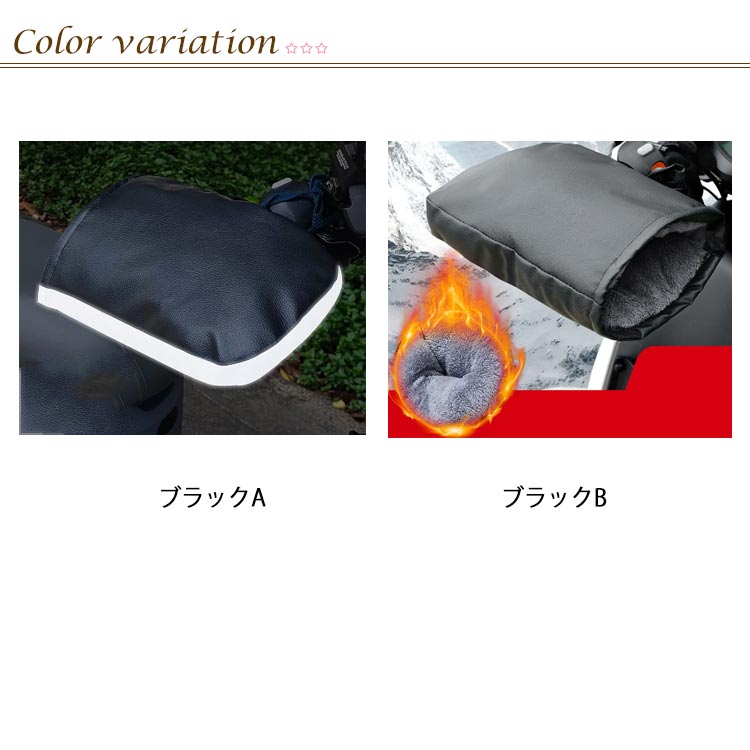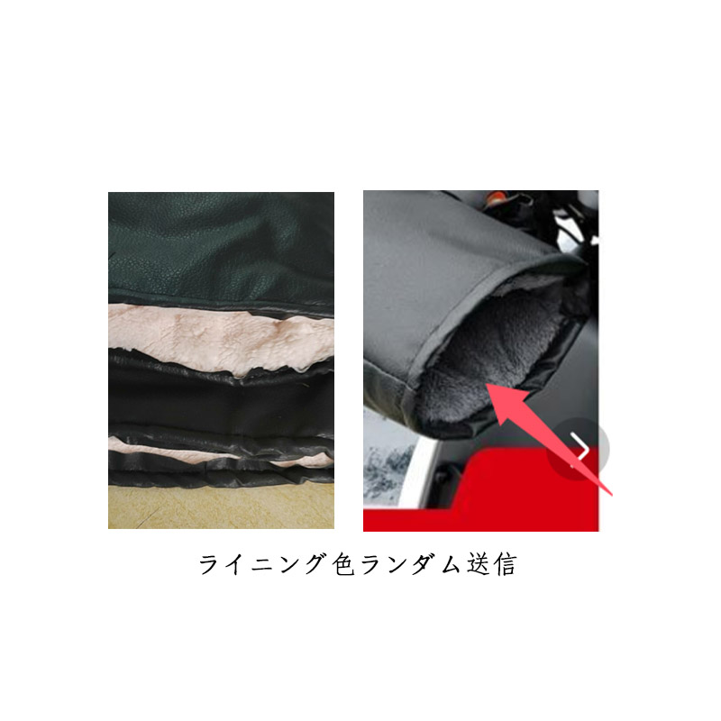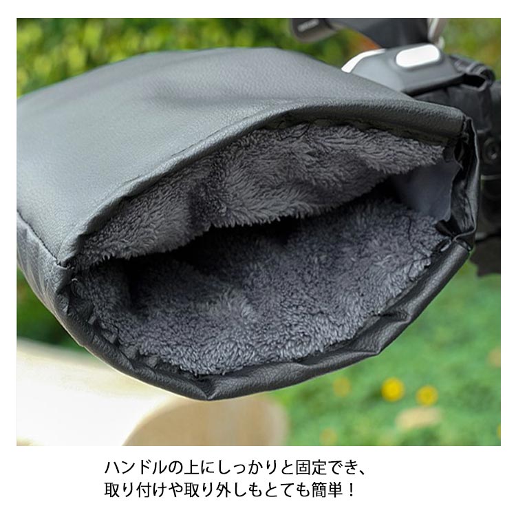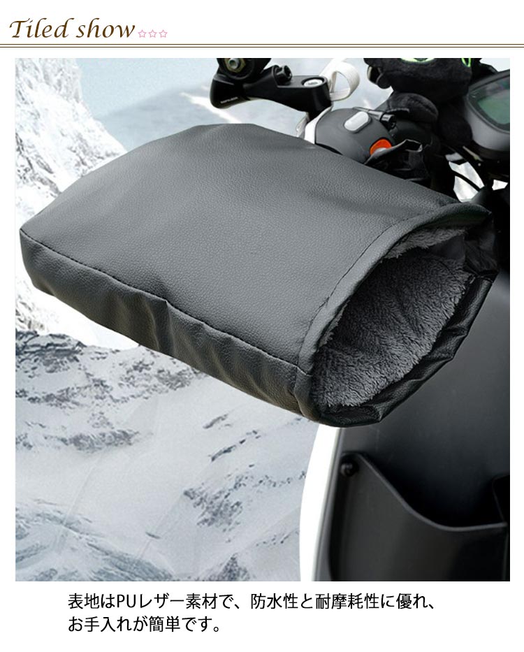 | 防寒?保温性抜群!バイク用 ハンドルカバー。 表地はPUレザー素材で、防水性と耐摩耗性に優れ、お手入れが簡単です。 反射ストリップが表面に追加され、夜間の旅行がより安全になります。 ハンドルの上にしっかりと固定でき、取り付けや取り外しもとても簡単! 厚手裏ボアが施され、モコモコの素材感で最適な肌触り&暖かい付け心地を雪、雨や寒い風から大切な手を守れます。 寒い冬に電気自動車やバイクで通勤?通学の方の強い味方です。 | |
