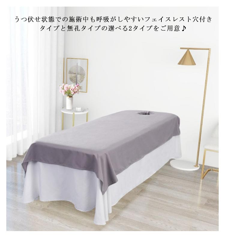 | ?マッサージベッドカバー ?柔らかくしっとりとした優しい肌触り。 ?うつ伏せ状態での施術中も呼吸がしやすいフェイスレスト穴付きタイプと無孔タイプの選べる2タイプをご用意? ?洗濯ネットに入れて洗濯機で洗えるから、お手入れがラクチン。 | |