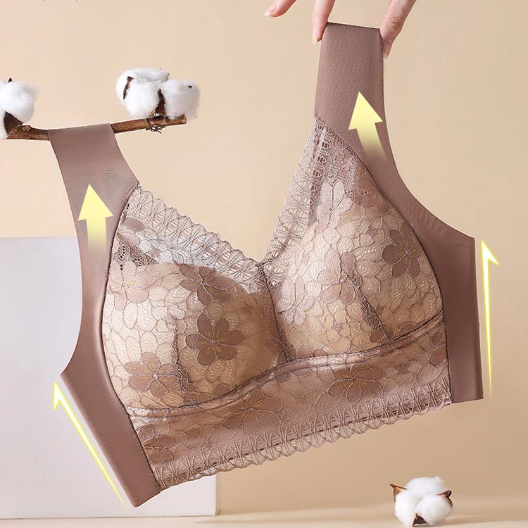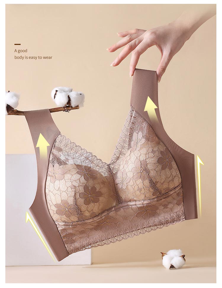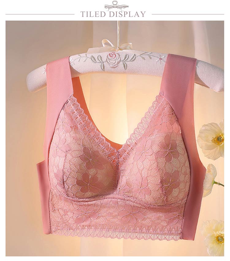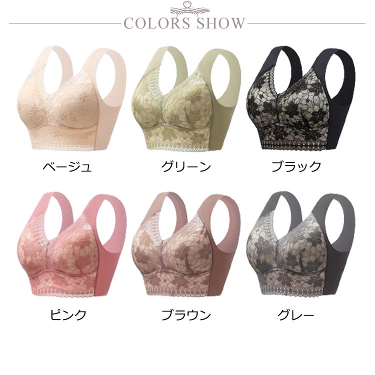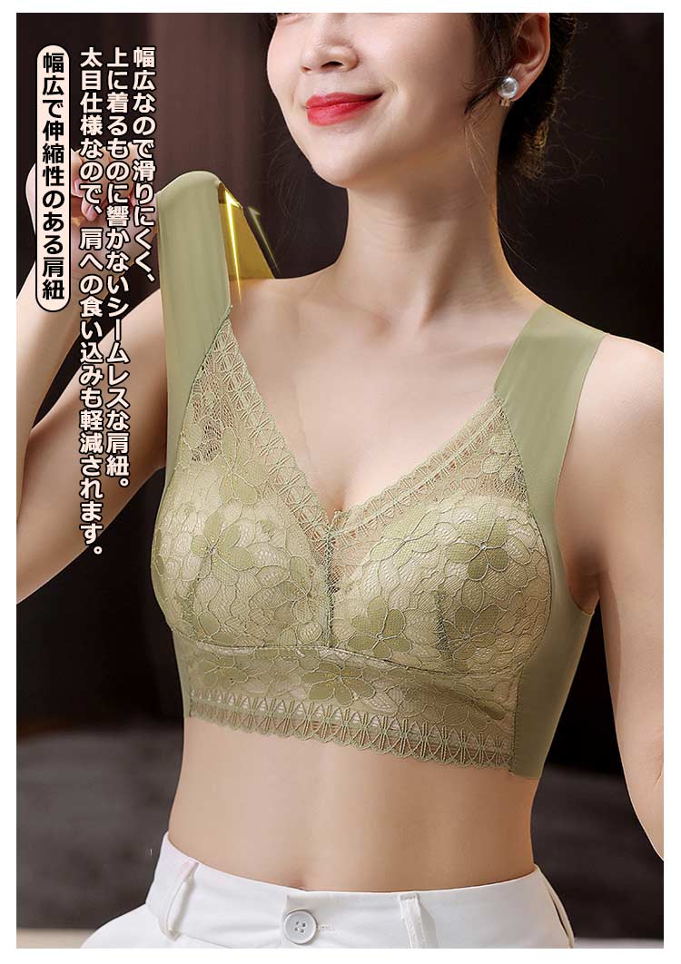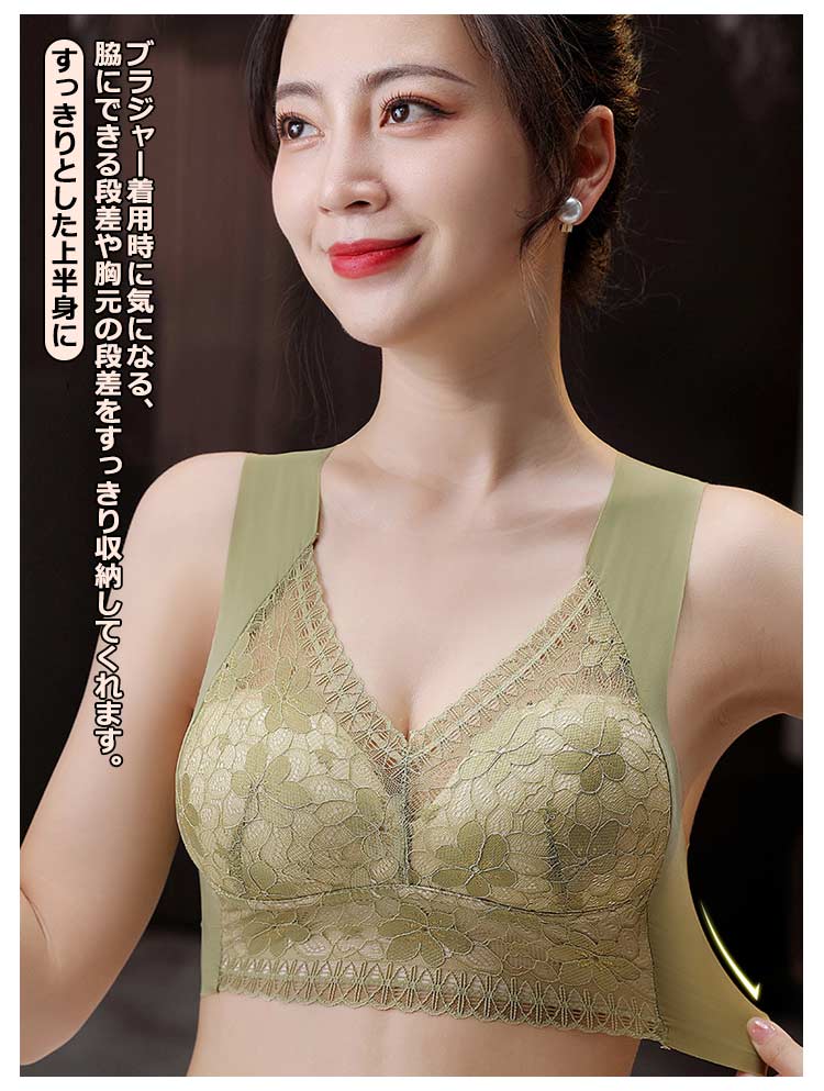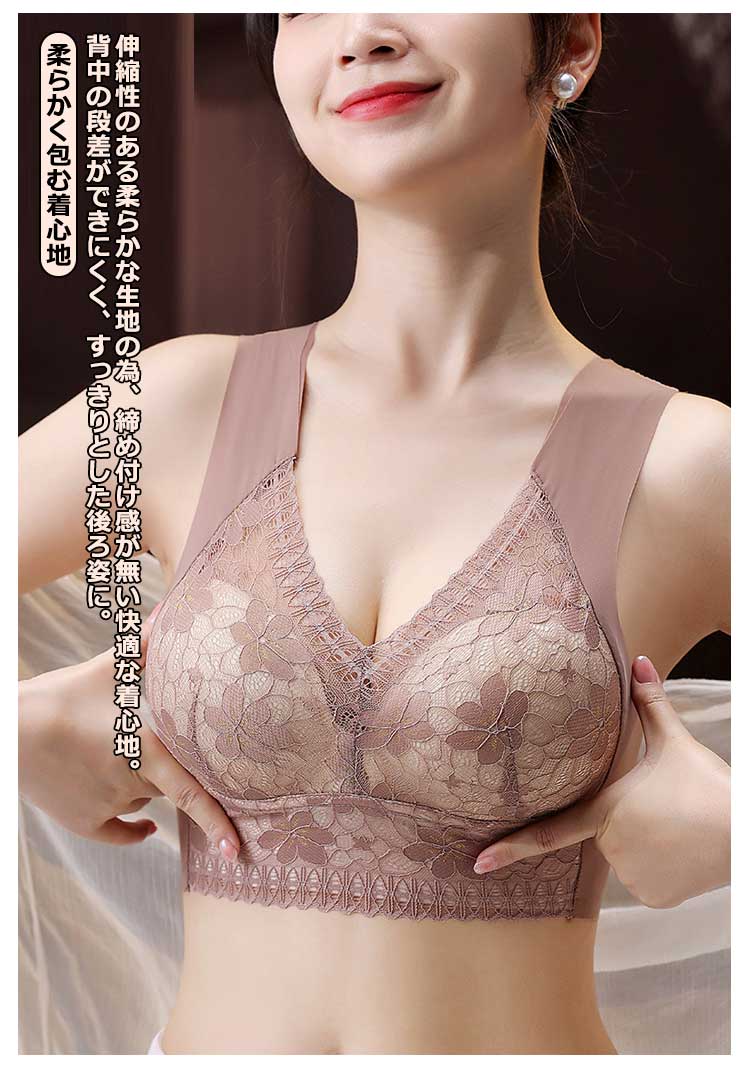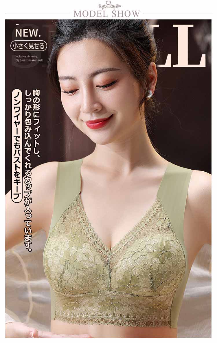 大きいサイズ胸を小さく見せるブラ!【ノンワイヤーでもバストをキープ】胸の形にフィットし、しっかり包み込んでくれるカップが入っています。【すっきりとした上半身に】ブラジャー着用時に気になる、脇にできる段差や胸元の段差をすっきり収納してくれます。【幅広で伸縮性のある肩紐】幅広なので滑りにくく、上に着るものに響かないシームレスな肩紐。太目仕様なので、肩への食い込みも軽減されます。【デザイン性と快適さ】通気性の良いメッシュ素材に、花柄レースがしっかり胸をつつんで綺麗なシルエットを作ります。【柔らかく包む着心地】伸縮性のある柔らかな生地の為、締め付け感が無い快適な着心地。背中の段差ができにくく、すっきりとした後ろ姿に。