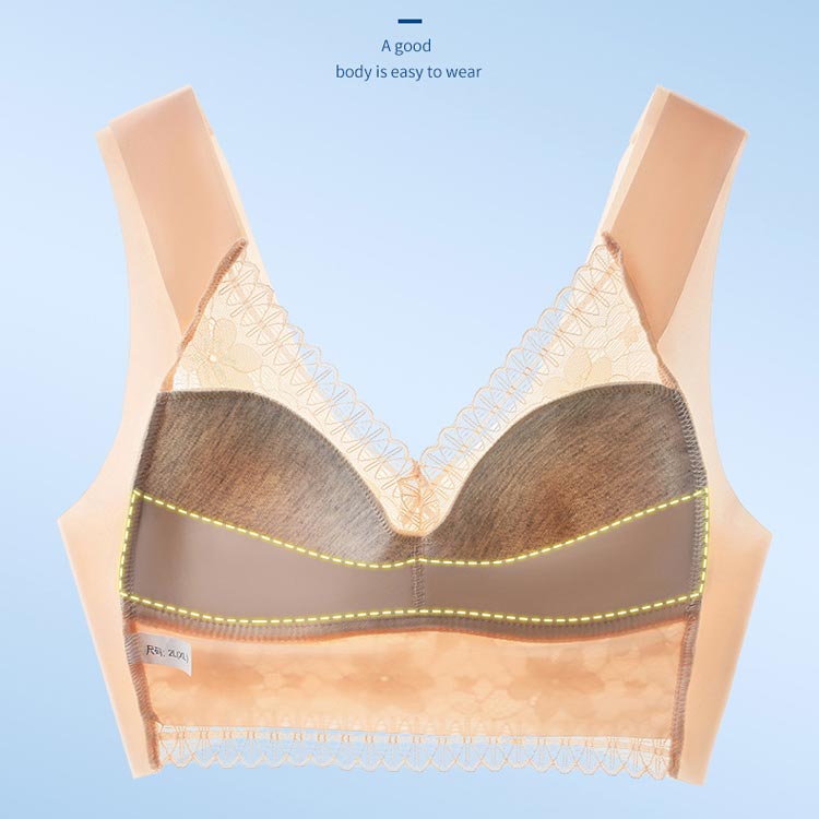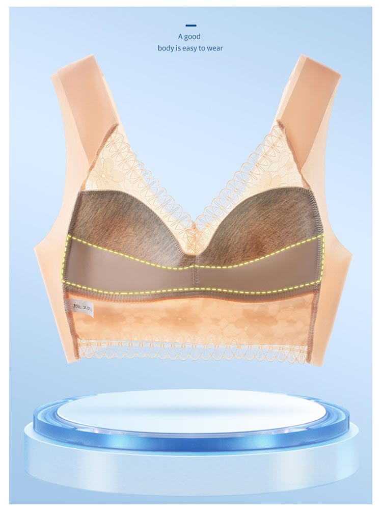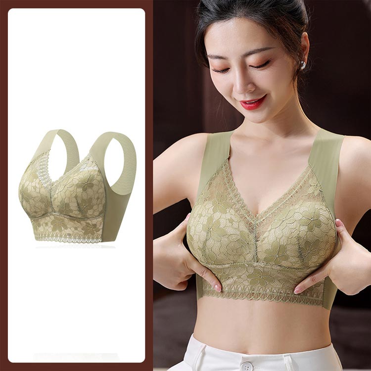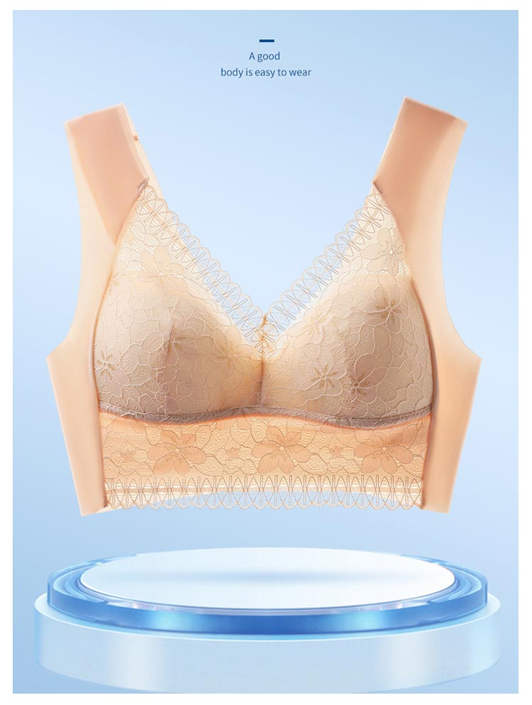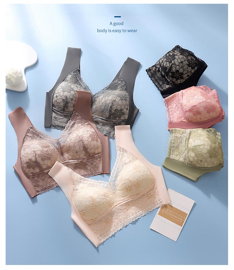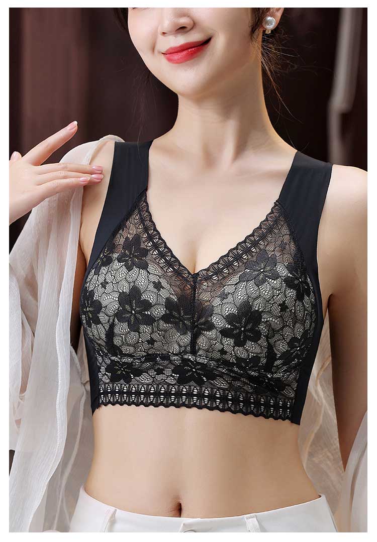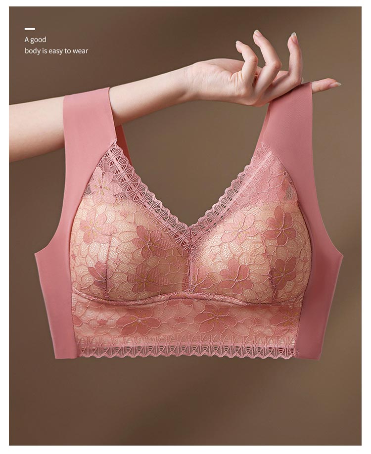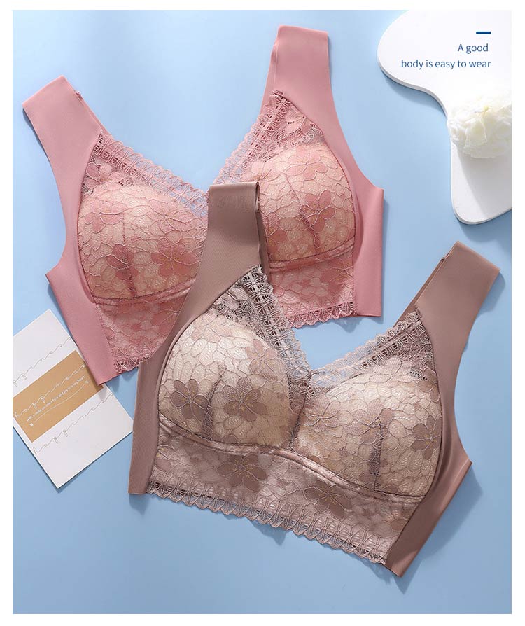 大きいサイズ胸を小さく見せるブラ!【ノンワイヤーでもバストをキープ】胸の形にフィットし、しっかり包み込んでくれるカップが入っています。【すっきりとした上半身に】ブラジャー着用時に気になる、脇にできる段差や胸元の段差をすっきり収納してくれます。【幅広で伸縮性のある肩紐】幅広なので滑りにくく、上に着るものに響かないシームレスな肩紐。太目仕様なので、肩への食い込みも軽減されます。【デザイン性と快適さ】通気性の良いメッシュ素材に、花柄レースがしっかり胸をつつんで綺麗なシルエットを作ります。【柔らかく包む着心地】伸縮性のある柔らかな生地の為、締め付け感が無い快適な着心地。背中の段差ができにくく、すっきりとした後ろ姿に。