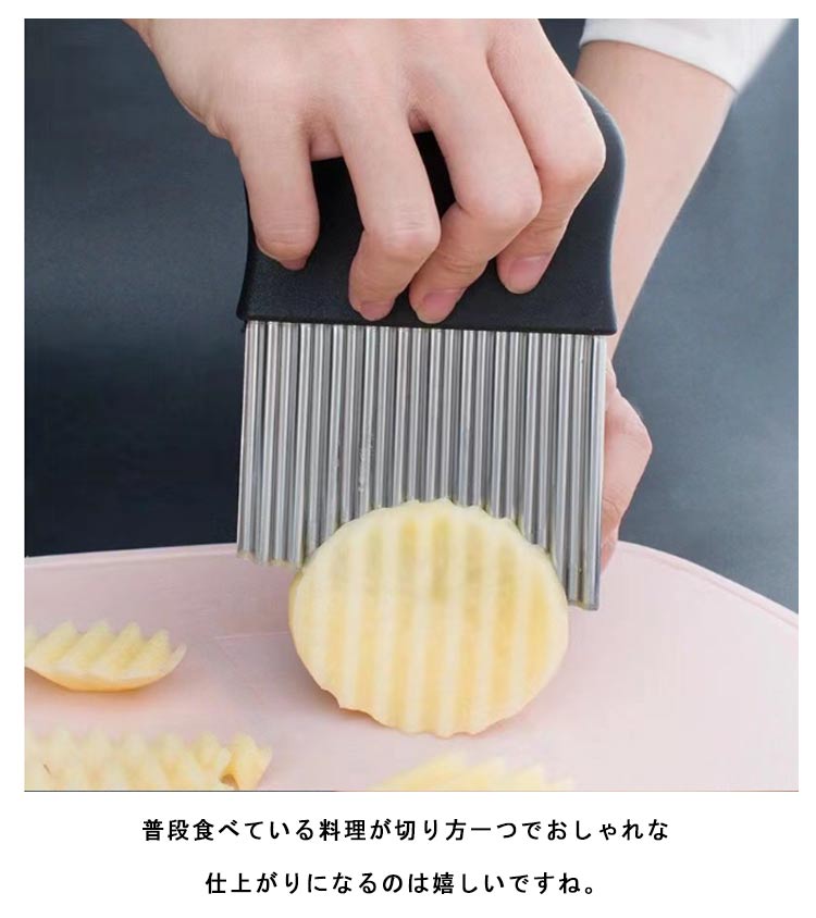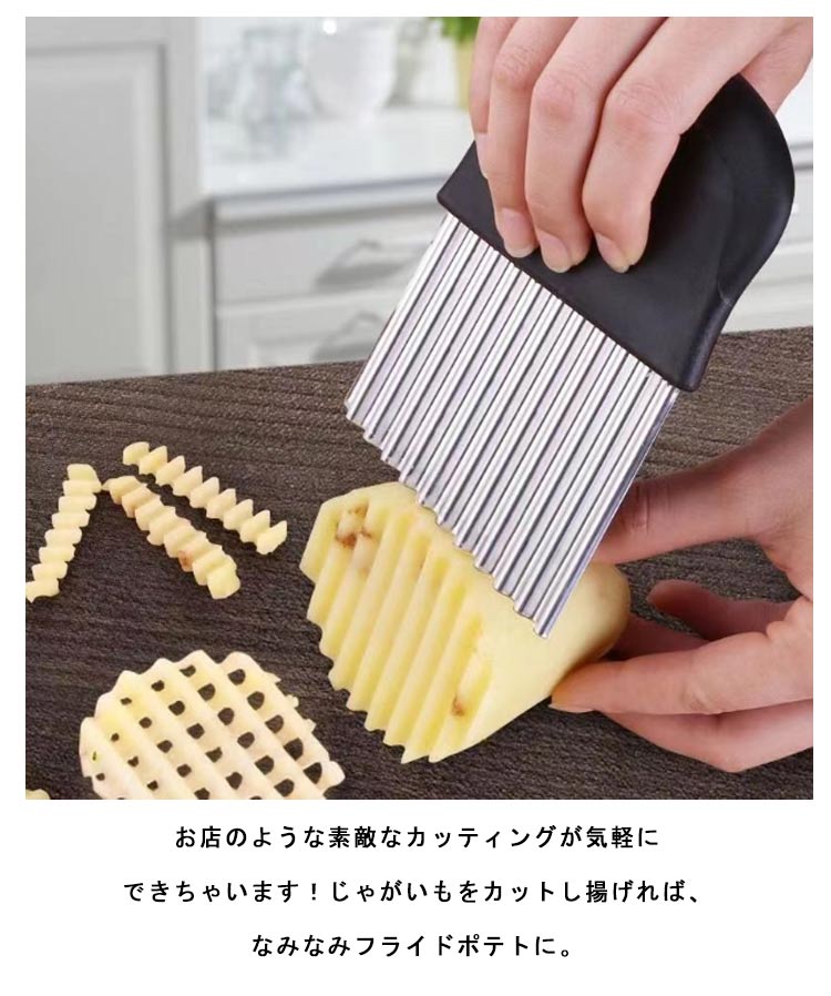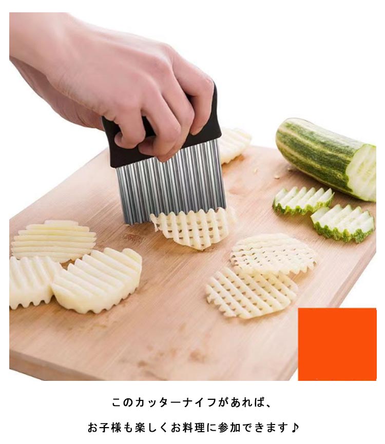 じゃがいもや人参やきゅうりなど食材を可愛く飾り切りできる波型カッター。刃面が波打っていて、ポテトや人参、大根などの野菜やチーズを切り口キレイな波型にスライスできます。お店のような素敵なカッティングが気軽にできちゃいます!じゃがいもをカットし揚げれば、なみなみフライドポテトに。このカッターナイフがあれば、お子様も楽しくお料理に参加できます♪普段食べている料理が切り方一つでおしゃれな仕上がりになるのは嬉しいですね。野菜はもちろんキウイやりんごなどの果物にもオススメです