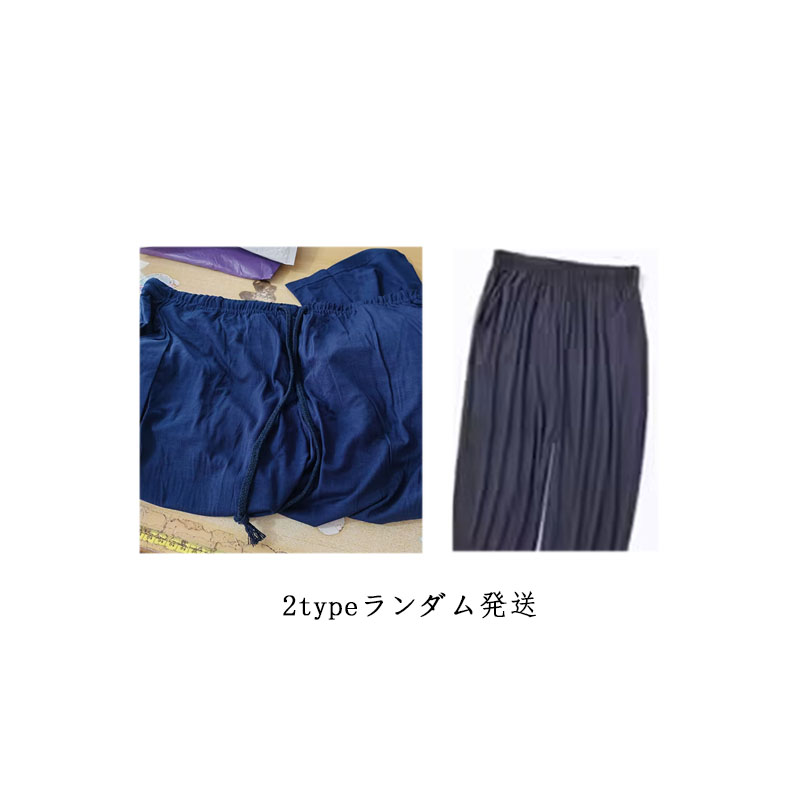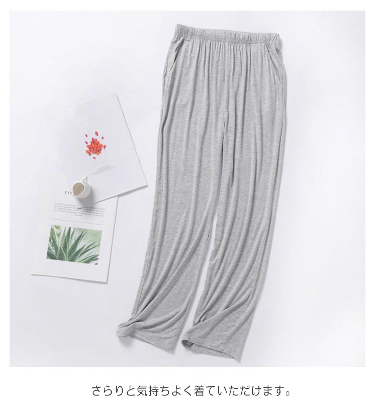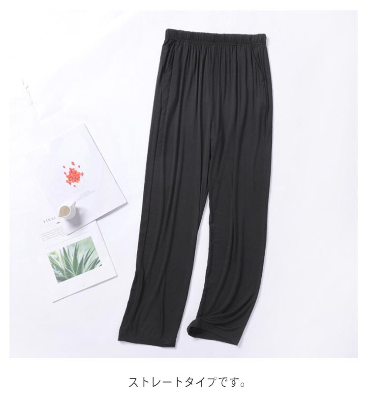 | ウエストゴムで部屋着やパジャマ、旅行先?機内でのリラックスウェアに最適な薄手パンツ。 ストレートタイプです。 さらりと気持ちよく着ていただけます。 | |