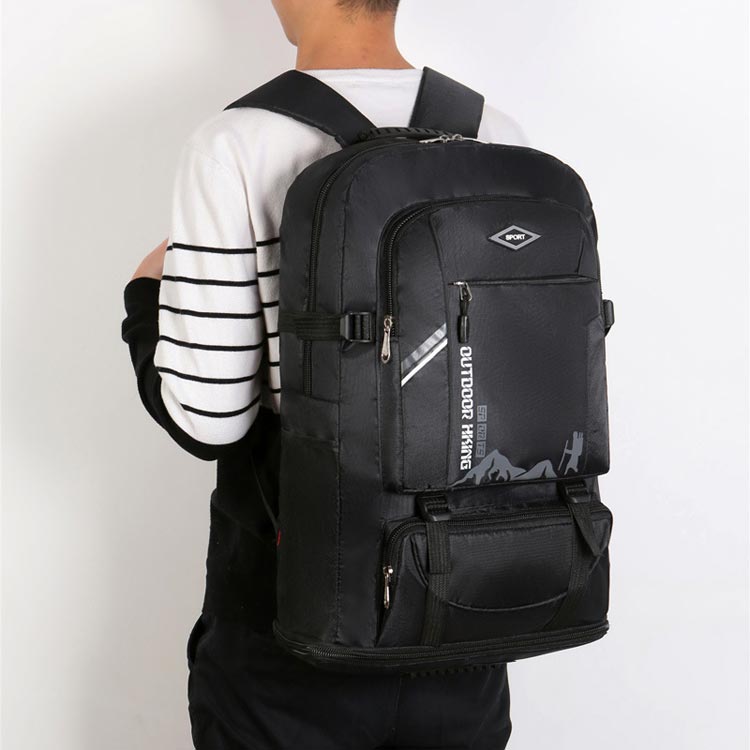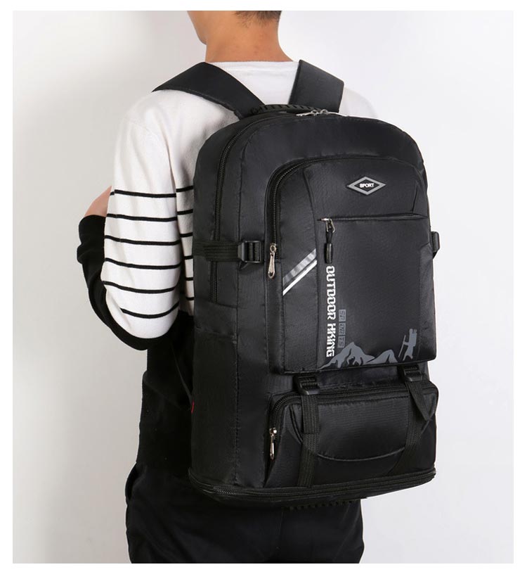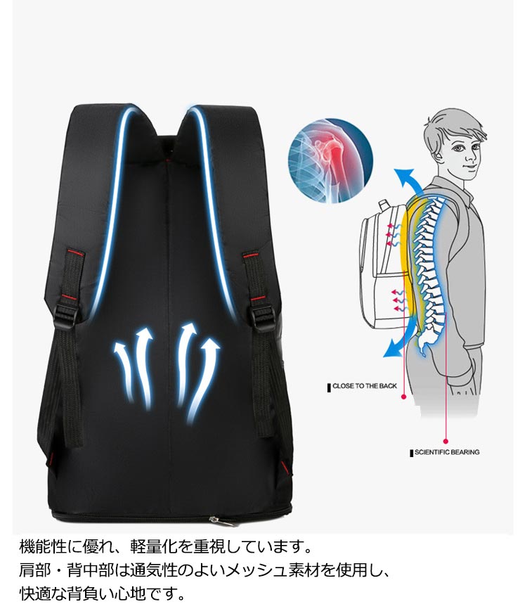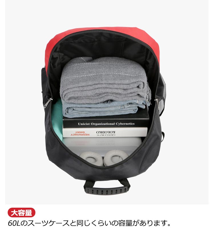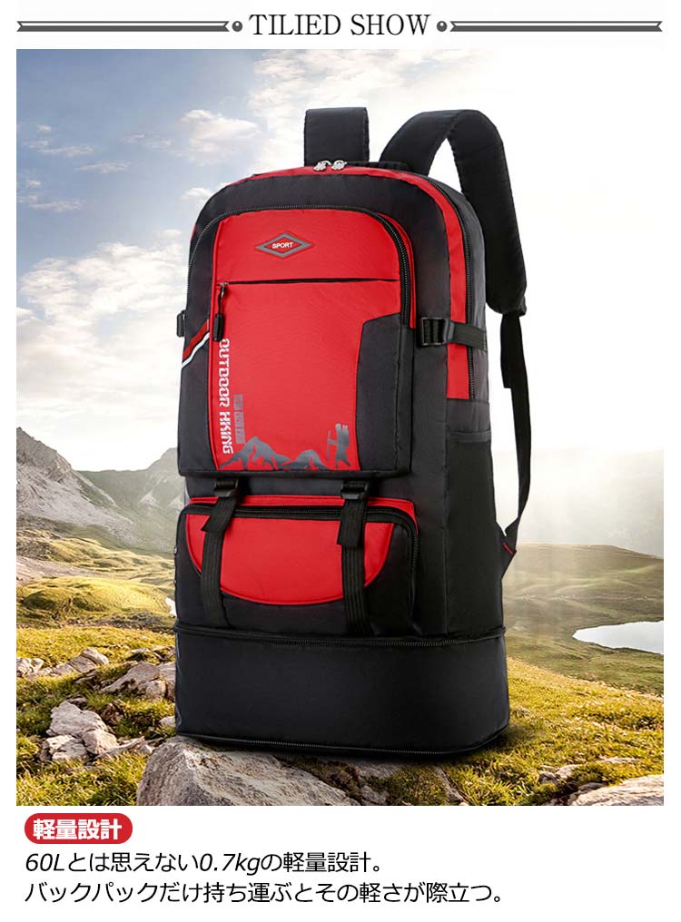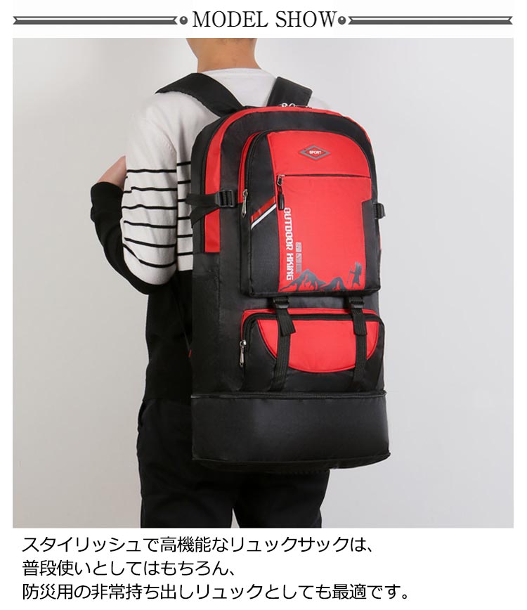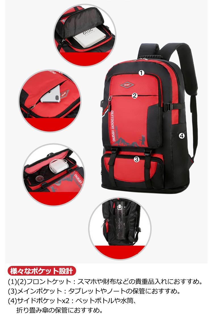 【大容量】60Lのスーツケースと同じくらいの容量があります【軽量設計】60Lとは思えない0.7kgの軽量設計。バックパックだけ持ち運ぶとその軽さが際立つ【防水設計】キャンプや防災などの不測の事態に大活躍!【様々なポケット設計】(1)(2)フロントケット:スマホや財布などの貴重品入れにおすすめ(3)メインポケット:タブレットやノートの保管におすすめ(4)サイドポケットx2:ペットボトルや水筒、折り畳み傘の保管におすすめ機能性に優れ、軽量化を重視しています。肩部・背中部は通気性のよいメッシュ素材を使用し、快適な背負い心地です。更に、両サイトにサイズ調整、下に容量拡大する機能も備えているので、自分で調整できます。スタイリッシュで高機能なリュックサックは、普段使いとしてはもちろん、防災用の非常持ち出しリュックとしても最適です。