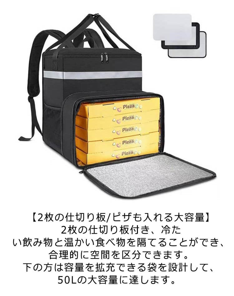デリバリーバッグ 出前館 ウーバーイーツ 保温 保冷 フード デリバリー バッグ 防水 配達バッグ 50L 保温保冷 ピザ 寿司入り 保温ピザバッグ 拡張可 耐荷重 仕切り板2枚 配達用 大容量 Uber Eats ウバック リュック カバン バックパック