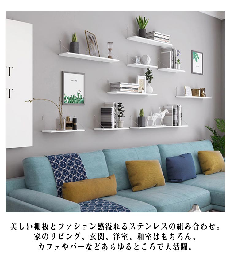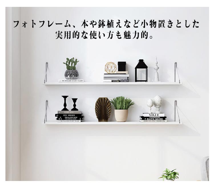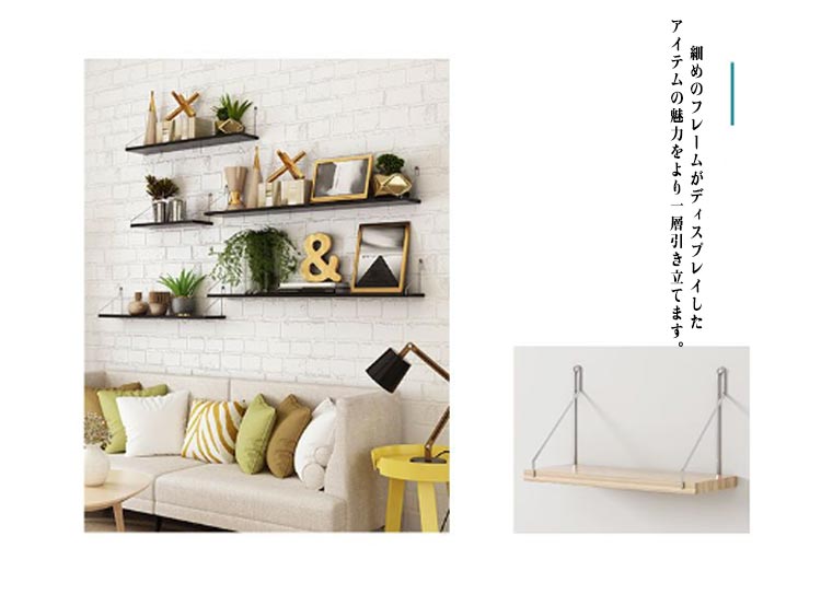 | シンプルなデザインで、どんなお部屋にもマッチするウォールシェルフ。 細めのフレームがディスプレイしたアイテムの魅力をより一層引き立てます。 ピンフックを使えば道具不要で、誰でも簡単に取り付け可能!しかも、ほとんど壁を傷つけません! 賃貸でも問題なく取り付けできますよ。 フォトフレーム、本や鉢植えなど小物置きとした実用的な使い方も魅力的。 美しい棚板とファション感溢れるステンレスの組み合わせ。家のリビング、玄関、洋室、和室はもちろん、カフェやバーなどあらゆるところで大活躍。 | |