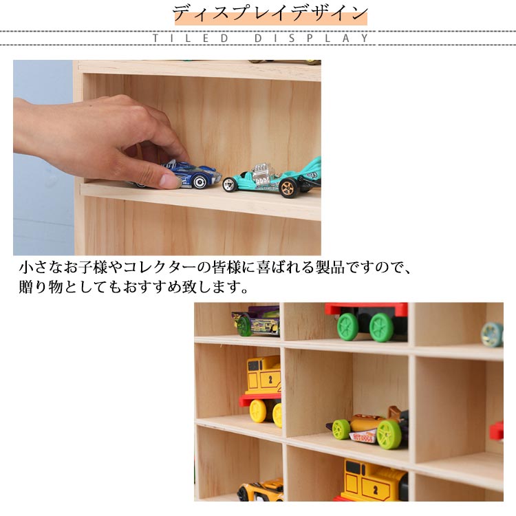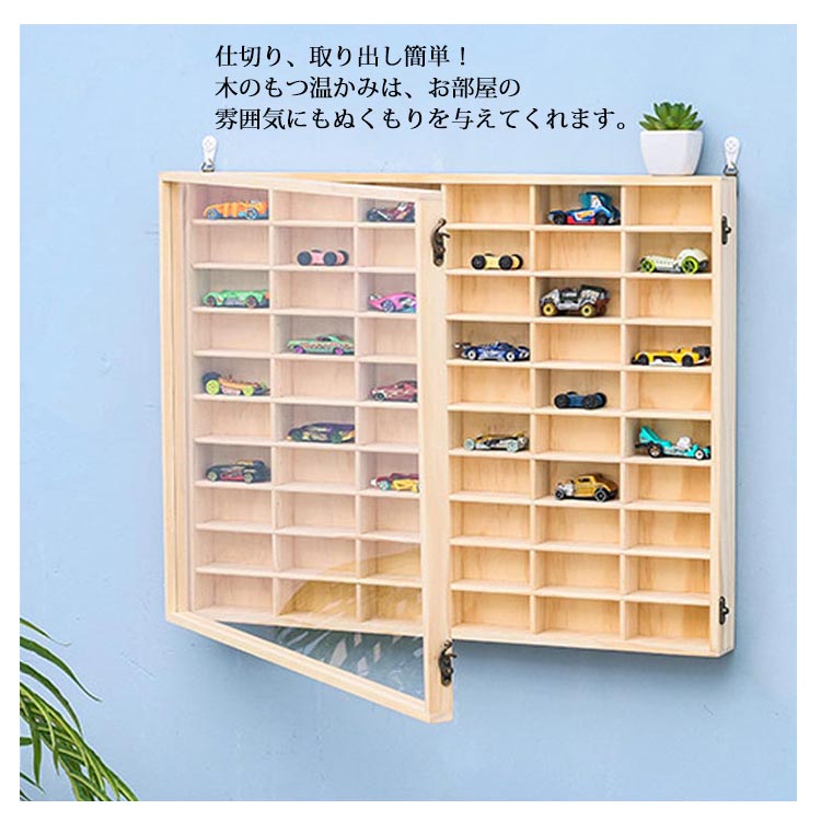 | 最大で60台のミニカーを収納できる、木製のコレクションケースです。 扉付きタイプ!扉がありますので、埃も避けられ、大切なミニカーを綺麗に保管?展示することが出来ます。 仕切り、取り出し簡単! 木のもつ温かみは、お部屋の雰囲気にもぬくもりを与えてくれます。 小さなお子様やコレクターの皆様に喜ばれる製品ですので、贈り物としてもおすすめ致します。 | |