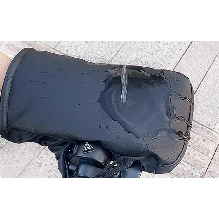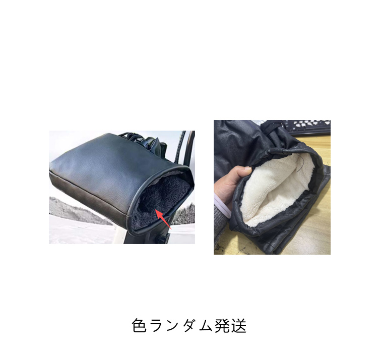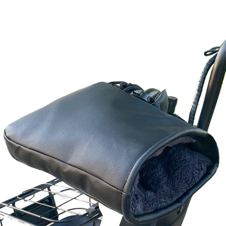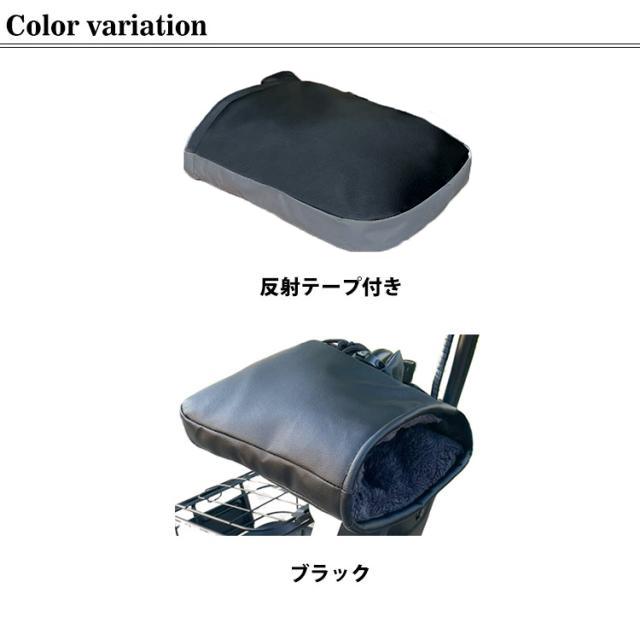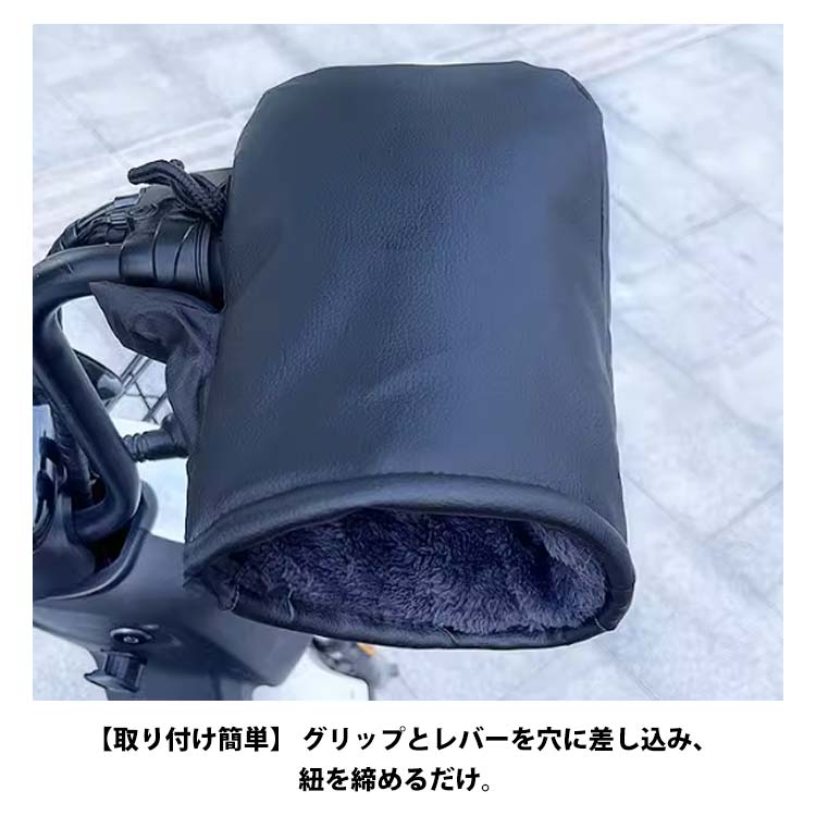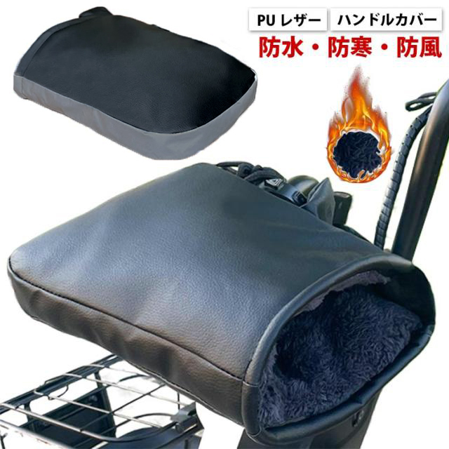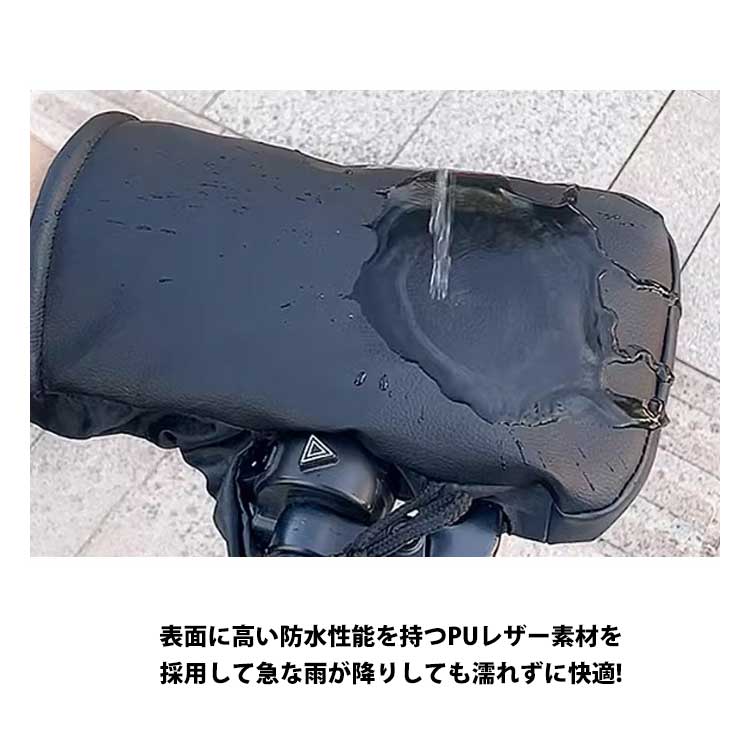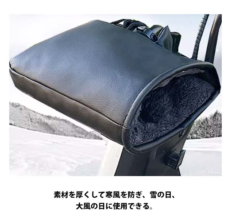 【ハンドルカバー】【防水・防寒・防風】【PU レザー】中綿入りのあたたかいハンドルカバーです。素材を厚くして寒風を防ぎ、雪の日、大風の日に使用できる。表面に高い防水性能を持つPUレザー素材を採用して急な雨が降りしても濡れずに快適!自転車、電動自転車、バイク、オートバイ/原付/スクーターなど幅広く対応できます。夜間の視認性にも配慮、反射テープ付いて、夜間の安全を保護します。【取り付け簡単】 グリップとレバーを穴に差し込み、紐を締めるだけ。