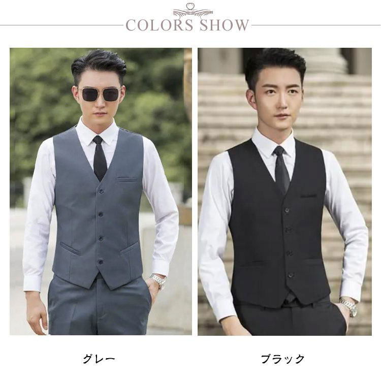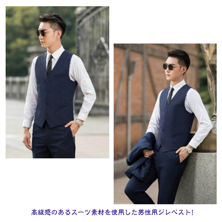 | S~5XLサイズ!大きいサイズ! 高級感のあるスーツ素材を使用した男性用ジレベスト! スリム作りで全体のラインがとてもキレイでスマートな印象に。 上品さ漂う5つのボタンは開け閉めで雰囲気が変わります。 バックベルトは、見た目もエレガントで、ゆるさ調節も簡単!(洗濯の際は金具をはずしてください) ワイシャツ、ジャケットと合わせてフォーマルに、Tシャツ等と合わせてカジュアルにスタイルに合わせて様々な着こなしが出来る定番アイテムです? | |