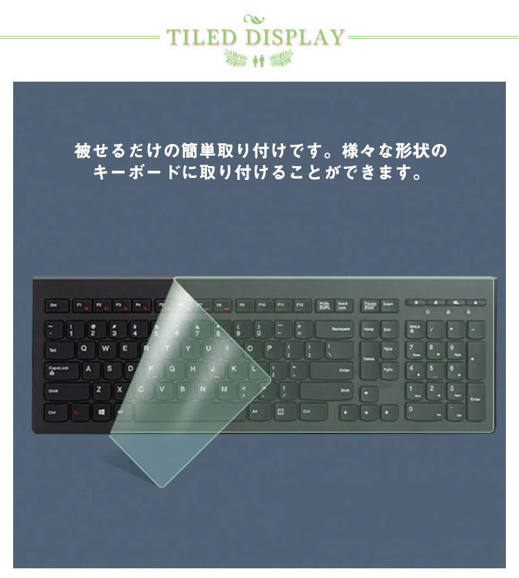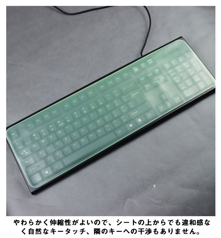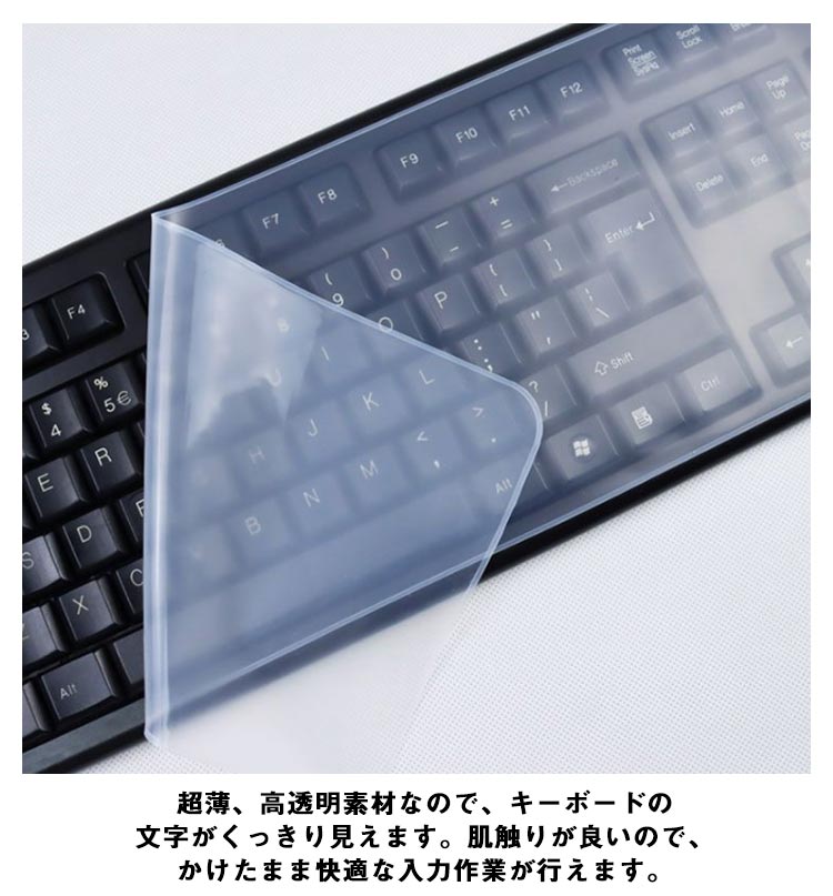対応機種を選ばないデスクトップキーボード用シリコンカバーです。被せるだけの簡単取り付けです。様々な形状のキーボードに取り付けることができます。やわらかく伸縮性がよいので、シートの上からでも違和感なく自然なキータッチ、隣のキーへの干渉もありません。超薄、高透明素材なので、キーボードの文字がくっきり見えます。肌触りが良いので、かけたまま快適な入力作業が行えます。フリーサイズなので、キーボード以外に電話機、電卓、リモコンなどの保護にも利用可能です。