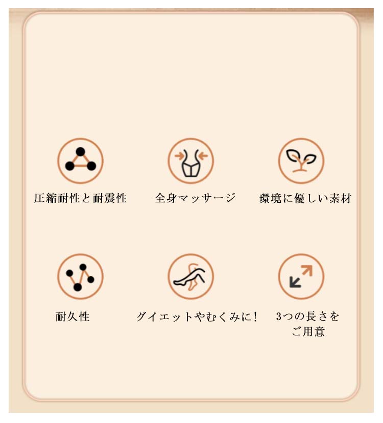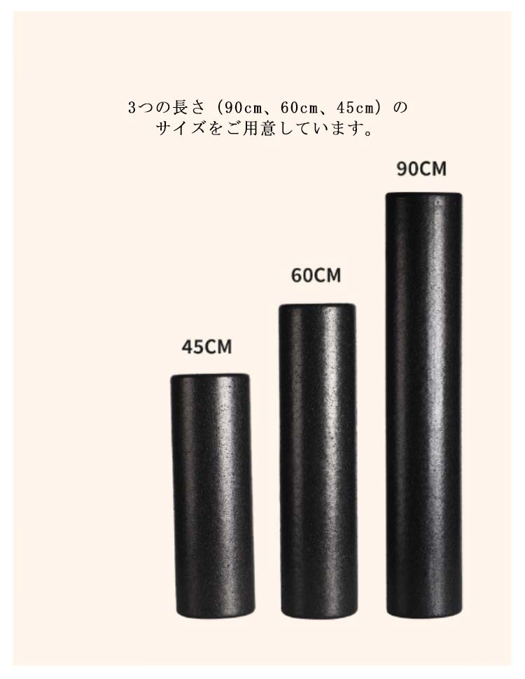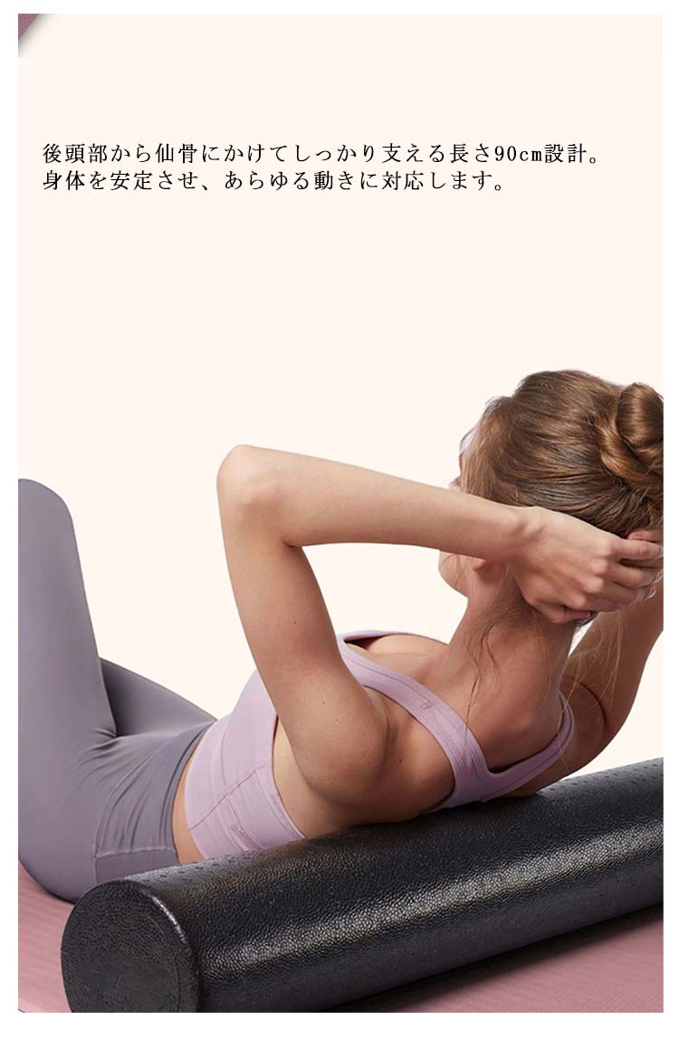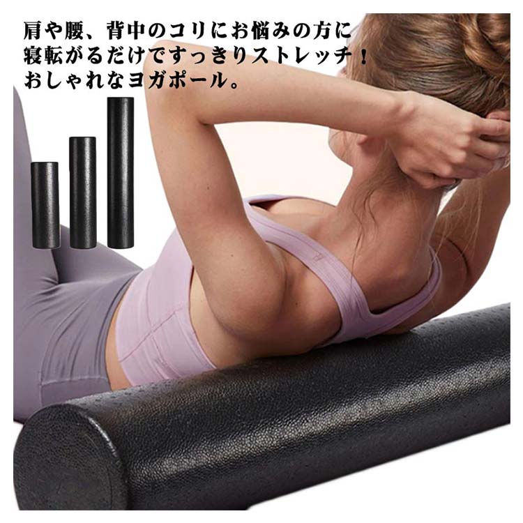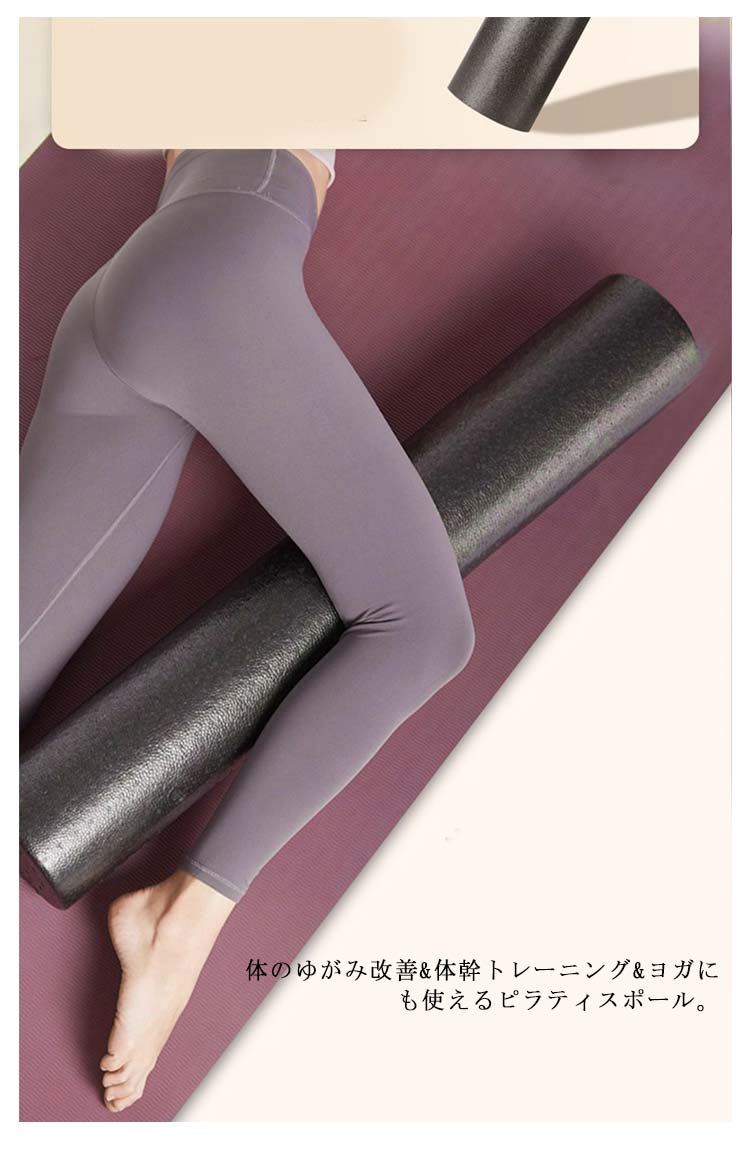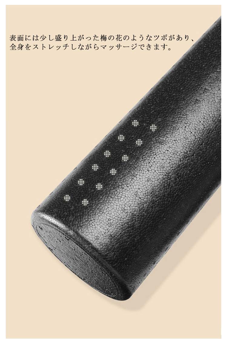 肩や腰、背中のコリにお悩みの方に寝転がるだけですっきりストレッチ!おしゃれなヨガポール。体のゆがみ改善&体幹トレーニング&ヨガにも使えるピラティスポール。「材質EPP」適度なクッション性と優れた耐久性を兼ね備えたポリエチレン天然材料を使ってますので、体に害はございません。さらに本体を丸洗いすることが出来ますので汗をかいても衛生的です。表面には少し盛り上がった梅の花のようなツボがあり、全身をストレッチしながらマッサージできます。3つの長さ(90cm、60cm、45cm)のサイズをご用意しています。後頭部から仙骨にかけてしっかり支える長さ90cm設計。身体を安定させ、あらゆる動きに対応します。ホールに寝転がってゴロゴロするだけで体のゆがみ矯正体幹トレーニングになります。実家・オフィス・ジムなどでご利用になってください。