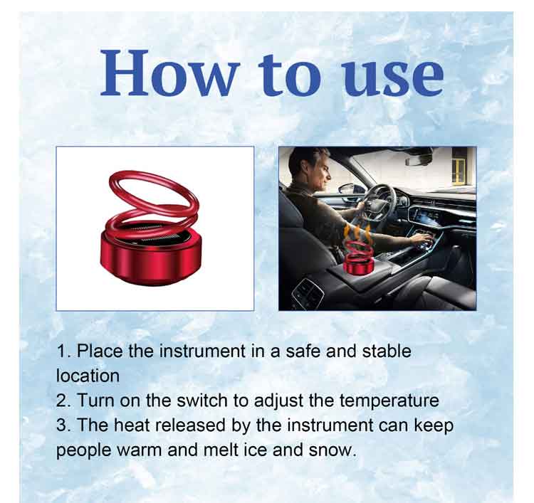 ポータブルキネティックミニヒーターは見た目が美しいだけでなく、太陽エネルギーで駆動され、コスト効率の高いソリューションを提供します。効率的に加熱できるだけでなく、より持続可能でヒーターにも貢献します。 暖かく保つ方法。 2個セット。運動エネルギー変換の段階!生成する運動エネルギーは利用され、効率的に穏やかで暖かい暖かさに変換されます。職場で先端のテクノロジーをシームレスに変換し、運動エネルギーを心地よい暖かさに包み込み、空間を包み込み、心地よい雰囲気を作り出します。多機能!アロマテラピーの装飾であることに加えて、車内の空気を浄化するのにも役立ち、運転体験をより快適で楽しいものにします。 同時に、リラックスした幸せな気分をもたらすかわいい装飾品でもあります。車内への取り付けが便利!使用説明:1. 装置を車内の安全で安定した位置に固定します。2. スイッチをオンにしてデバイスをアクティブにします。3. 機器から放出された熱は人を暖め、氷雪を溶かすことができる。