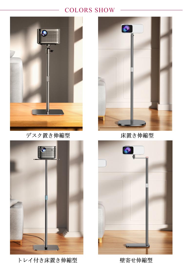 | 色 | デスク置き伸縮型 床置き伸縮型 トレイ付き床置き伸縮型 壁寄せ伸縮型 |