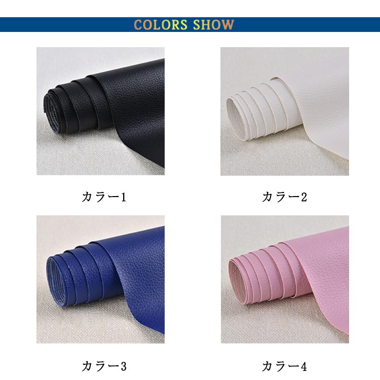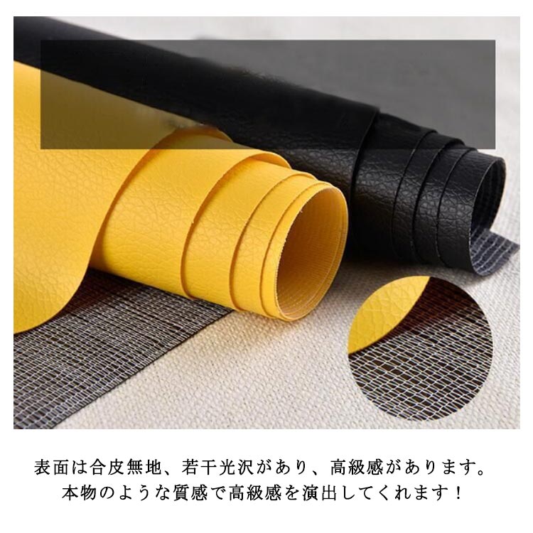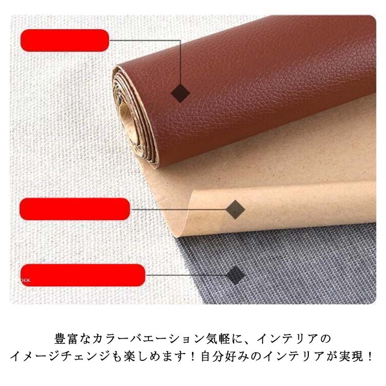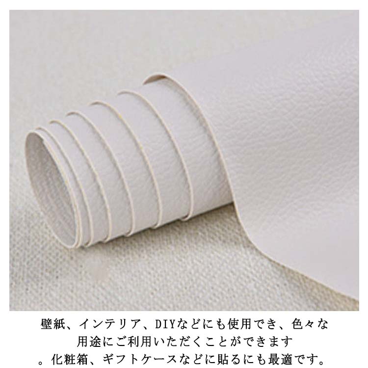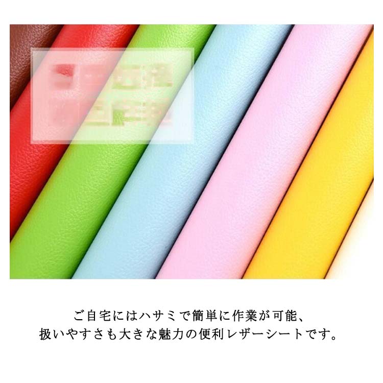 全20色!貼るレザー!防水、柔らかめ、接着性抜群!丈夫で柔らかい合皮レザー生地、伸びが良いので、曲面にも馴染ませることができます。表面は合皮無地、若干光沢があり、高級感があります。本物のような質感で高級感を演出してくれます!合皮レザー生地の裏面が接着シールになっており、様々な物に貼り付けることが出来ます。接着剥の粘着力が優れていて簡単に剥がれません。ご自宅にはハサミで簡単に作業が可能、扱いやすさも大きな魅力の便利レザーシートです。豊富なカラーバエーション気軽に、インテリアのイメージチェンジも楽しめます!自分好みのインテリアが実現!補修シールとして自転車のサドル・車のシート・バイクのシート・ソファーのシートなどの張り替え、修補、破れ隠し、椅子の座面張替。壁紙、インテリア、DIYなどにも使用でき、色々な用途にご利用いただくことができます。化粧箱、ギフトケースなどに貼るにも最適です。