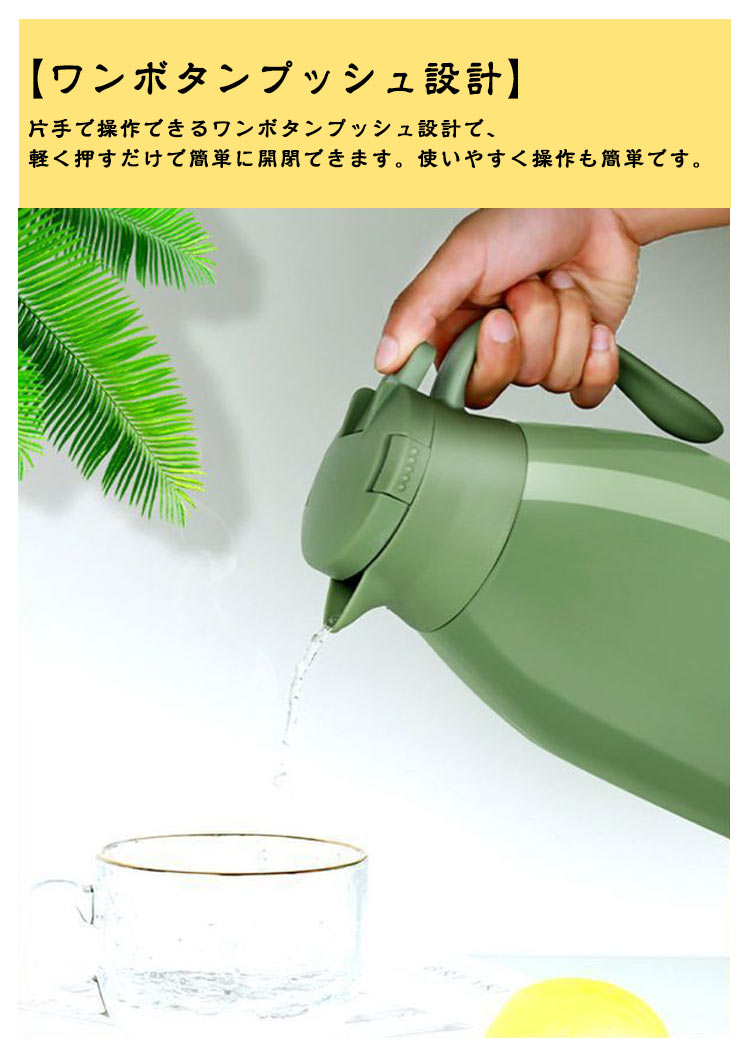 【真空断熱技術と5層断熱設計】この断熱テーブルは真空断熱技術と2層構造になっており、温水・冷水の保温に役立ちます。放熱性、断熱性に優れています。 5層断熱、24時間真空断熱。【2L大容量】2Lの大容量は、頻繁に水を沸かさないので、その日の飲料水ニーズに応え、時間を節約できます。広く使用されている温かい飲み物と冷たい飲み物(お茶、コーヒー、水、ジュースなど)を数時間置いて、飲料の安全性と健康を確保できます。ただし、水を入れすぎないように注意してください。【ワンボタンプッシュ設計】片手で操作できるワンボタンプッシュ設計で、軽く押すだけで簡単に開閉できます。使いやすく操作も簡単です。【密閉性高い】シリコン製のリングを使用すると、密閉されて漏れが防止されます。逆さにしても、漏れることはありません。