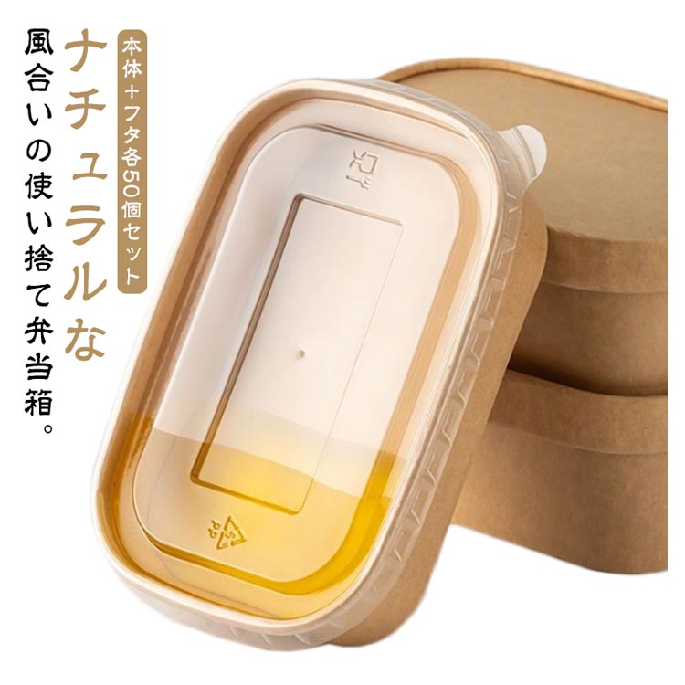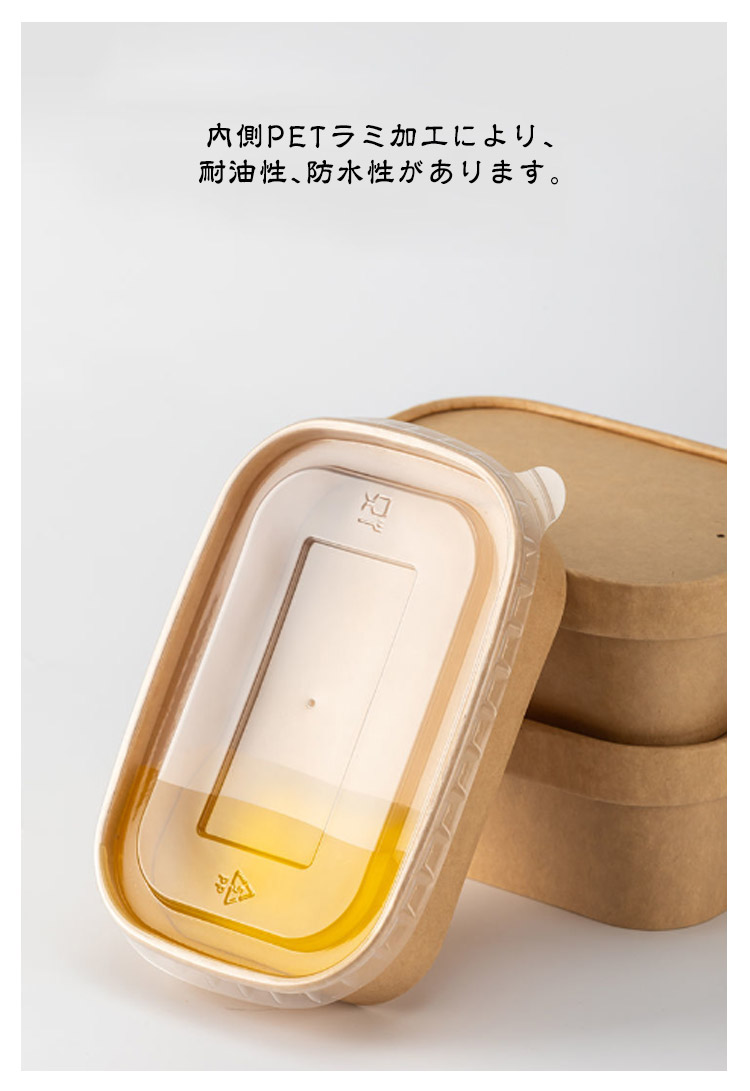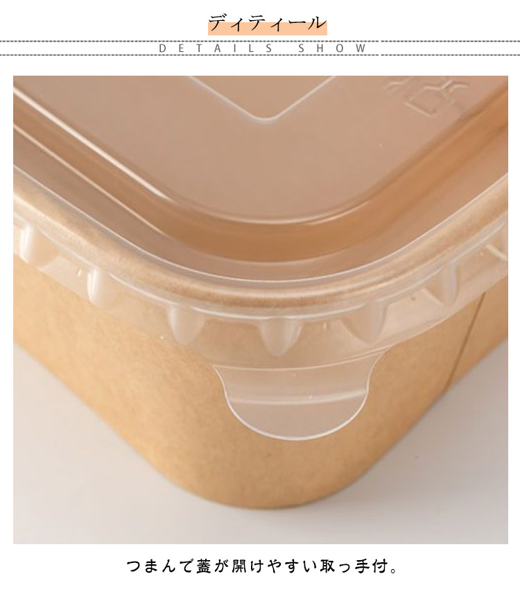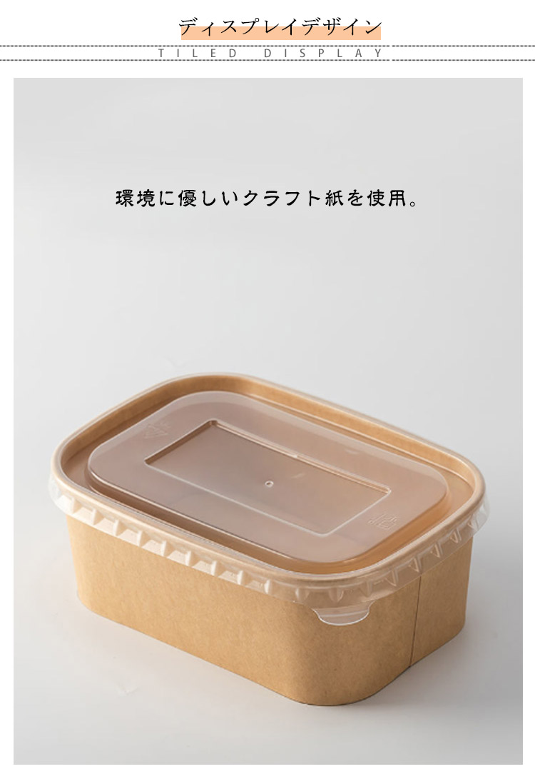 | ナチュラルな風合いの使い捨て弁当箱。 本体+フタ各50個セット 環境に優しいクラフト紙を使用。 内側PETラミ加工により?耐油性?防水性があります? 耐熱温度は120℃、耐冷温度は-20℃!電子レンジ?冷蔵庫使用可 つまんで蓋が開けやすい取っ手付。 お弁当からサンドイッチ、サラダなどの軽食までお使いいただけます。 | |