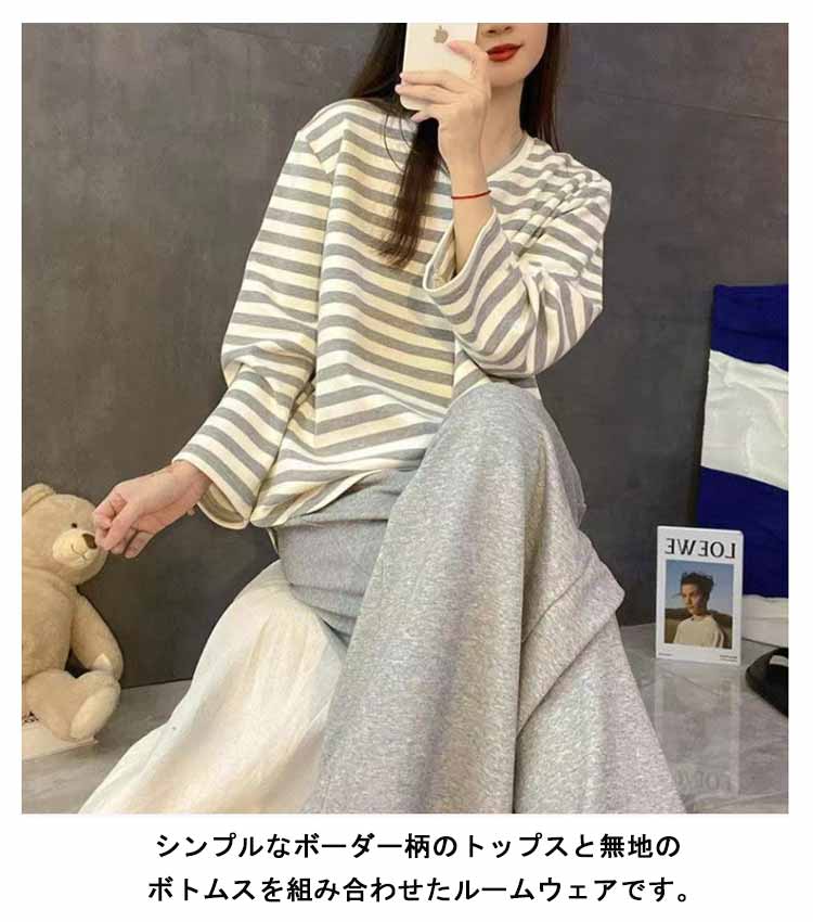 選べる半袖・長袖2タイプ!カップ付き!ボーダー柄ルームウェアシンプルなボーダー柄のトップスと無地のボトムスを組み合わせたルームウェアです。柔らかい肌触りで着心地も抜群。安心のカップ付き。ブラジャーの締め付け感から解放されつつ、サラサラと心地いいひとときを過ごせます。パンツはウエストゴム仕様でストレスフリーなはき心地。両サイドにポケットがついているので小物を入れたりするのに便利。トレンド感のあるラフなシルエットは、長時間履いても締め付け感ゼロ!夏のリラックス時間には、カップ付きのルームウェアがおススメ。