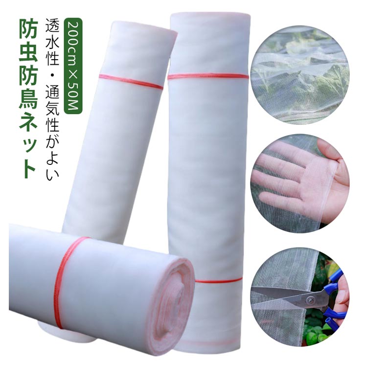 透水性・通気性がよい防虫防鳥ネット。【200cm×50M】約1mmの極細メッシュ構造により、植物を害虫から保護する同時に、鳥よけ、防氷雪も可能。また、透水性・通気性が良く、シートを被せた状態で散水が可能。必要的な日光、空気、水分を通過させ、植物の発育と成長にあまり影響を与えません。薬を使わず虫の侵入をカットするから、無農薬栽培にピッタリ。高品質のポリエチレンPE素材を採用しており、異臭や毒性がないだけでなく、耐低温性、耐熱性にも優れ、強度が高くて耐久性も良い。