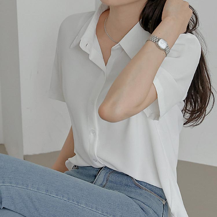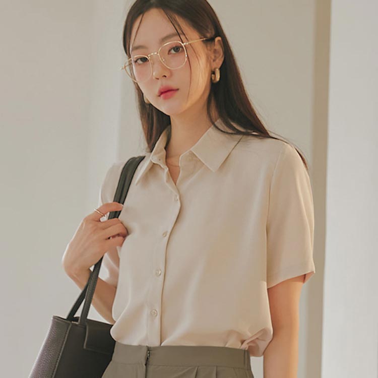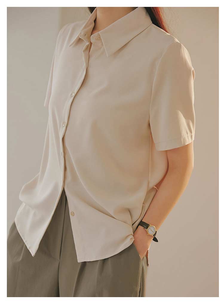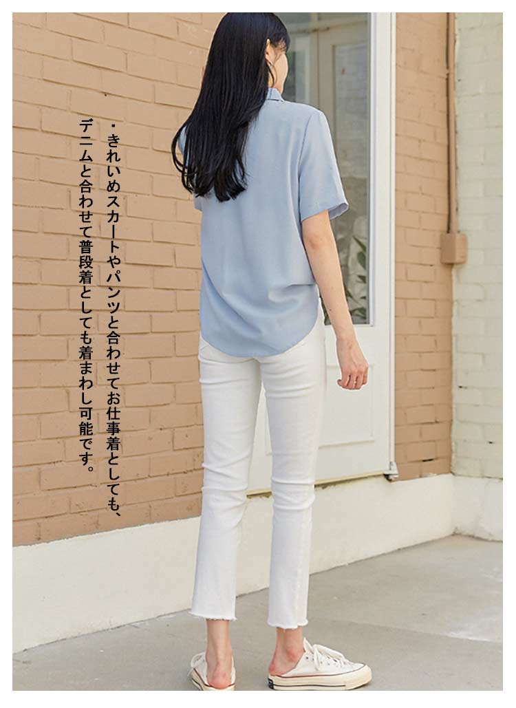 ・着回し力ばっちり。シンプルなデザインの半袖ブラウス・着心地軽やかでストレスフリー・様々なボトムに合うコンパクトなシルエット・きれいめスカートやパンツと合わせてお仕事着としても、デニムと合わせて普段着としても着まわし可能です。