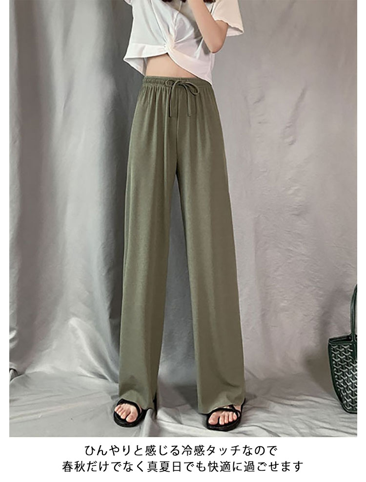 選べる2タイプ丈!冷感ワイドパンツ。選べる九分丈とロング丈、お好みによってお選びいただけます。ひんやりと感じる冷感タッチなので春秋だけでなく真夏日でも快適に過ごせます。ボディラインを拾わないワイドシルエット×ストレートのデザイン。ストレッチの効いた生地なので穿き心地も抜群。また、ストンとした落ち感で縦のラインを強調しスタイルアップも。