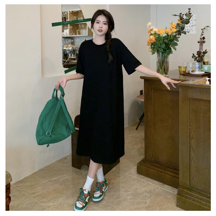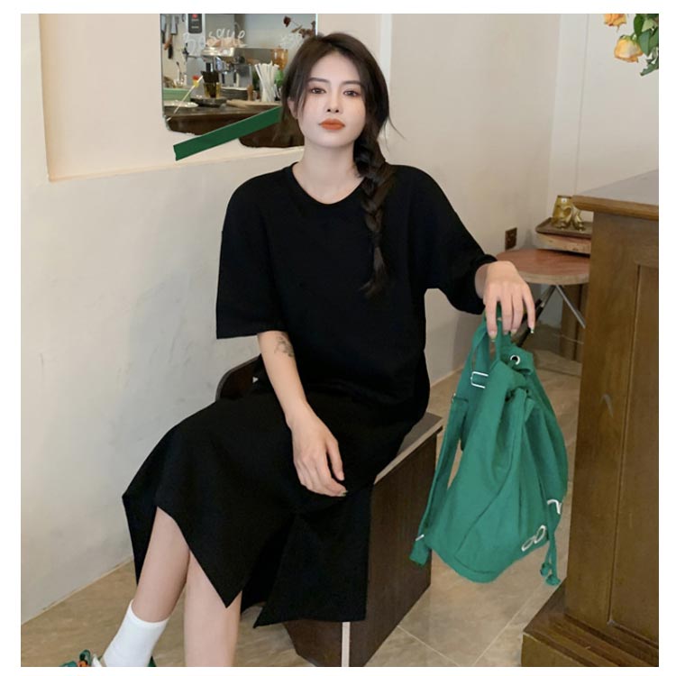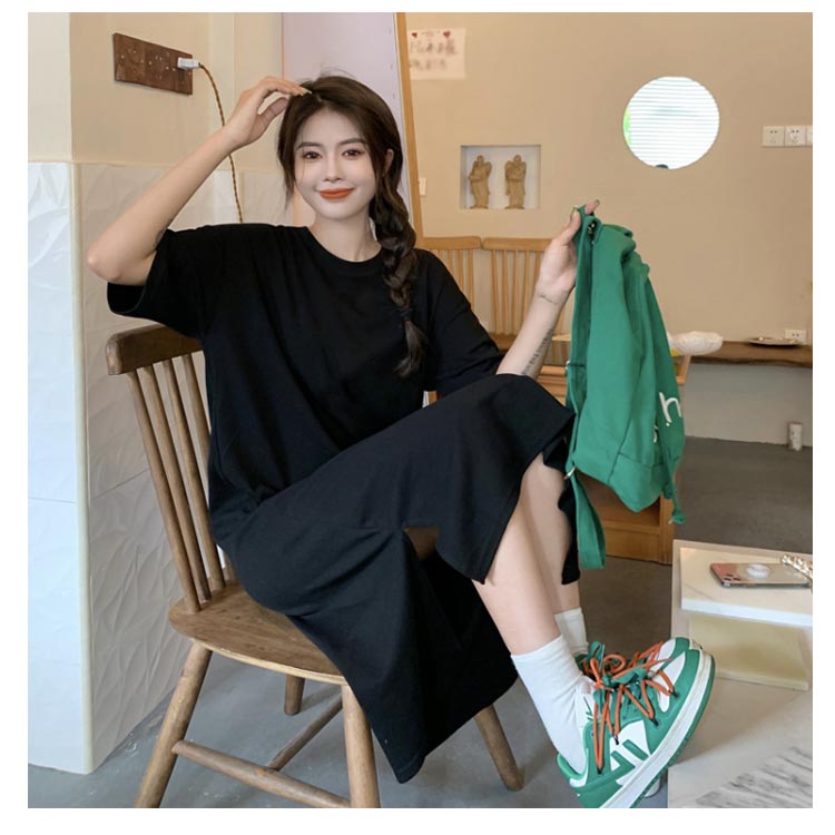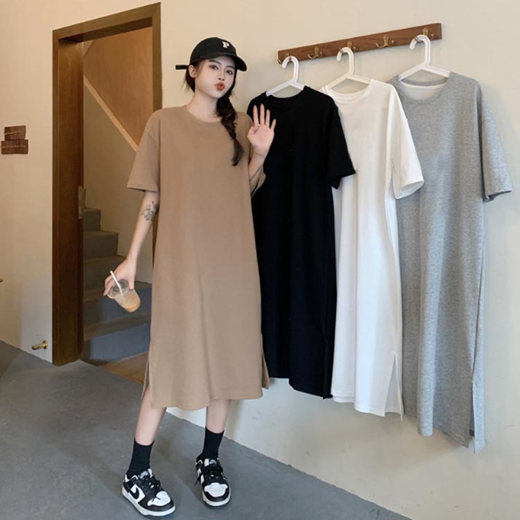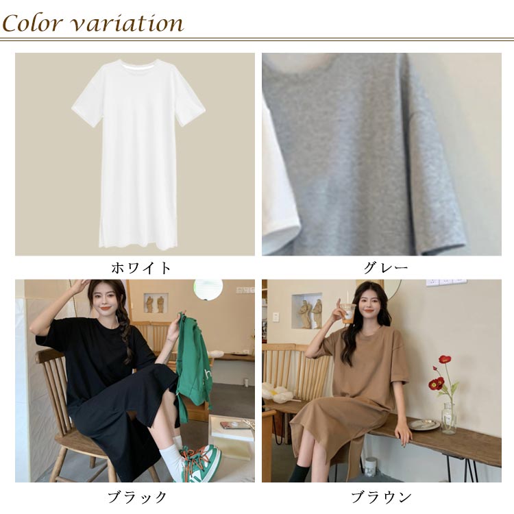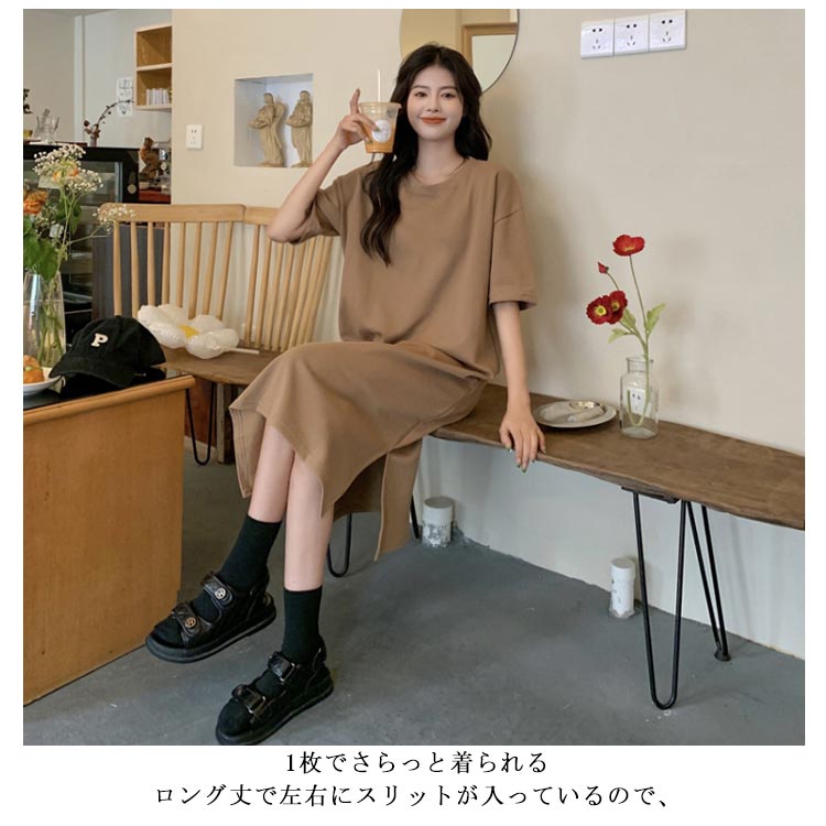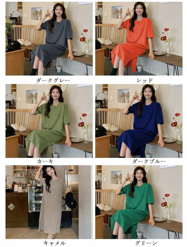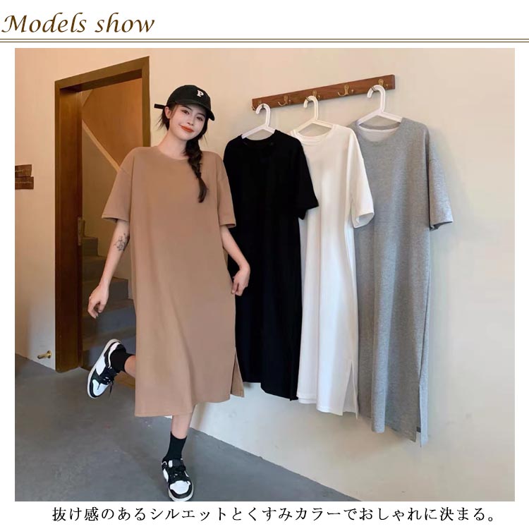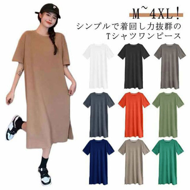 M~4XL! シンプルで着回し力抜群のTシャツワンピース抜け感のあるシルエットとくすみカラーでおしゃれに決まる。生地をたっぷり使って美しいドレープに仕上げました。1枚でさらっと着られるロング丈で左右にスリットが入っているので、ボトムやレギンスと合わせてもキレイに着られます。