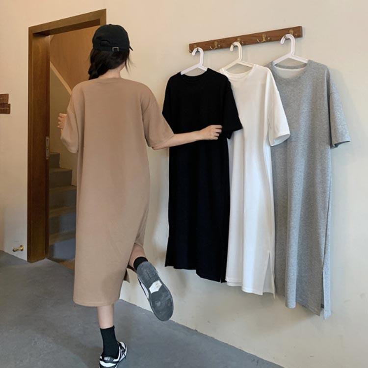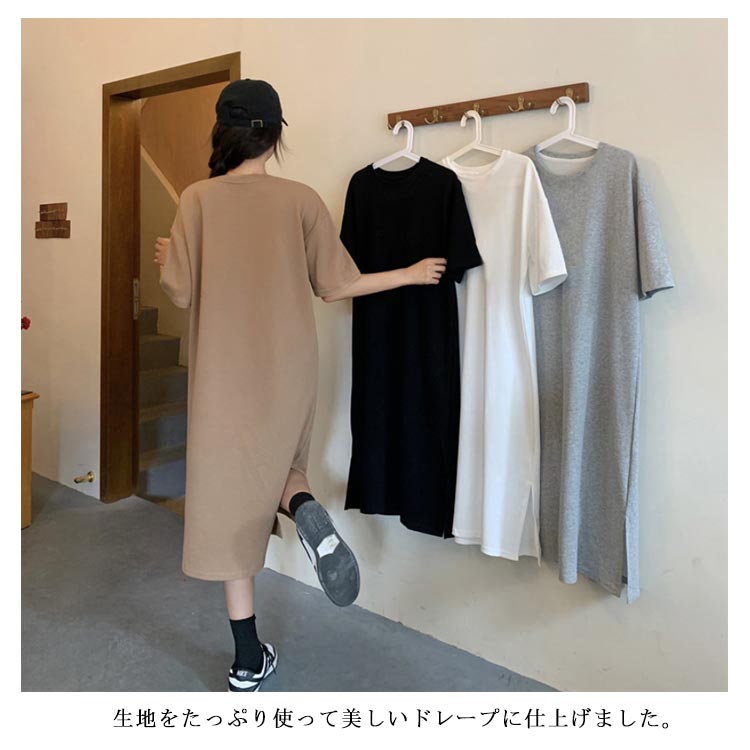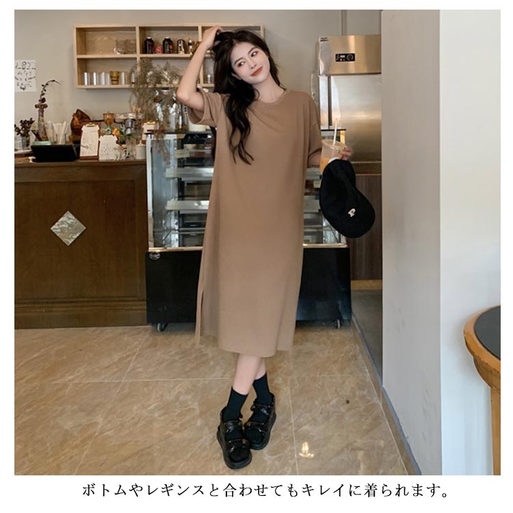 半袖 ワンピース ロングワンピース tシャツワンピース フレア レディース 春 夏 丸首 スリット Tシャツワンピ クルーネック ゆったり 体型カバー 細見え 着痩せ 無地 きれいめ インナー ルームウェア マタニティ おしゃれ オフィス 通勤