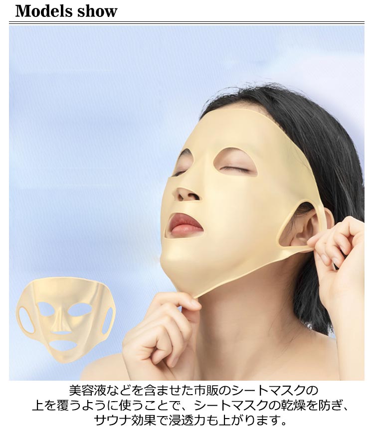 | 2個組 シートマスクの効果を上げられる、シリコン素材のフェイスマスク。 美容液などを含ませた市販のシートマスクの上を覆うように使うことで、 シートマスクの乾燥を防ぎ、サウナ効果で浸透力も上がります。 フィット感が高く、立った姿勢で家事をしながらマスクをするのもOK! 表面がべたつかず、マスク中に眼鏡もかけられるので、マスクが気軽にできます。 入浴時には1枚で、サウナマスクとして活躍させても! | |