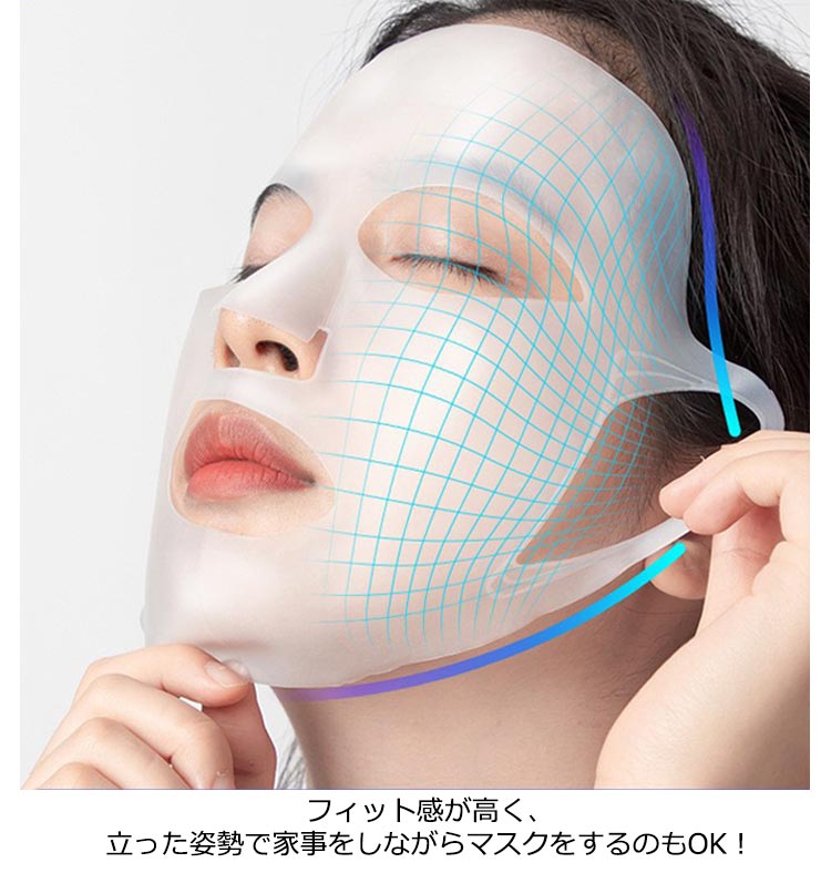 2個組シートマスクの効果を上げられる、シリコン素材のフェイスマスク。美容液などを含ませた市販のシートマスクの上を覆うように使うことで、シートマスクの乾燥を防ぎ、サウナ効果で浸透力も上がります。フィット感が高く、立った姿勢で家事をしながらマスクをするのもOK!表面がべたつかず、マスク中に眼鏡もかけられるので、マスクが気軽にできます。入浴時には1枚で、サウナマスクとして活躍させても!