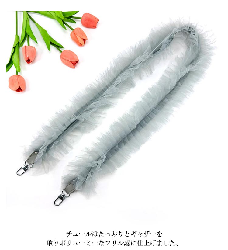 チュールフリルで華やかに♪トレンドのチュール素材を使ったショルダーストラップ。スマホやミニバッグに付けてお楽しみいただけます。チュールはたっぷりとギャザーを取りボリューミーなフリル感に仕上げました。フェミニンでドレスライクな気分を味わえるチュールの特別感は、デイリーのみならず、パーティーやオケージョンシーンにもおすすめです。