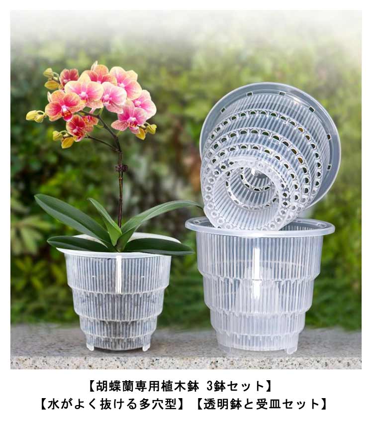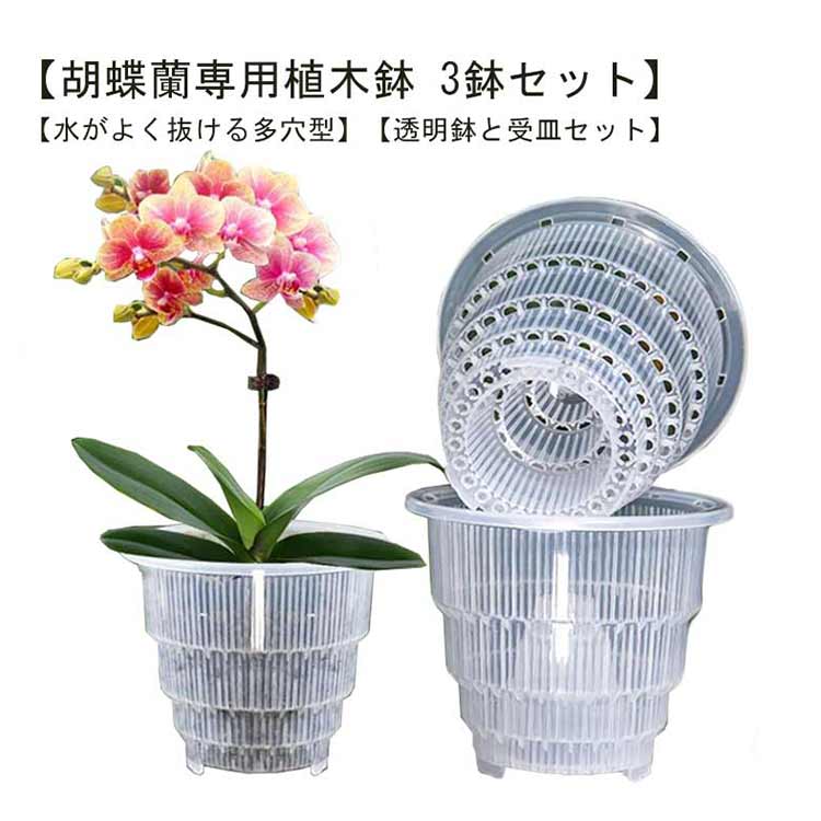 胡蝶蘭専用 植木鉢 3鉢セット 胡蝶蘭の植え替え 鉢 受皿付き 多穴型 通気性抜群 根腐れ防止 直径12cm 直径15cm 排水穴付き プラスチック おしゃれ 蘭の鉢 観葉植物の鉢 透明 クリア 根が見える鉢 多肉植物 洋蘭 胡蝶蘭 送料無料