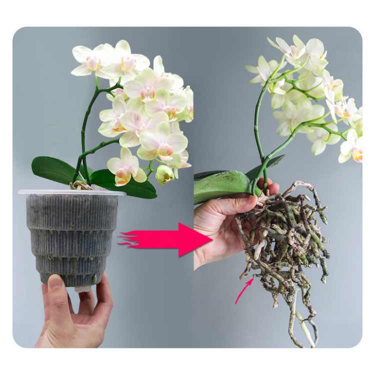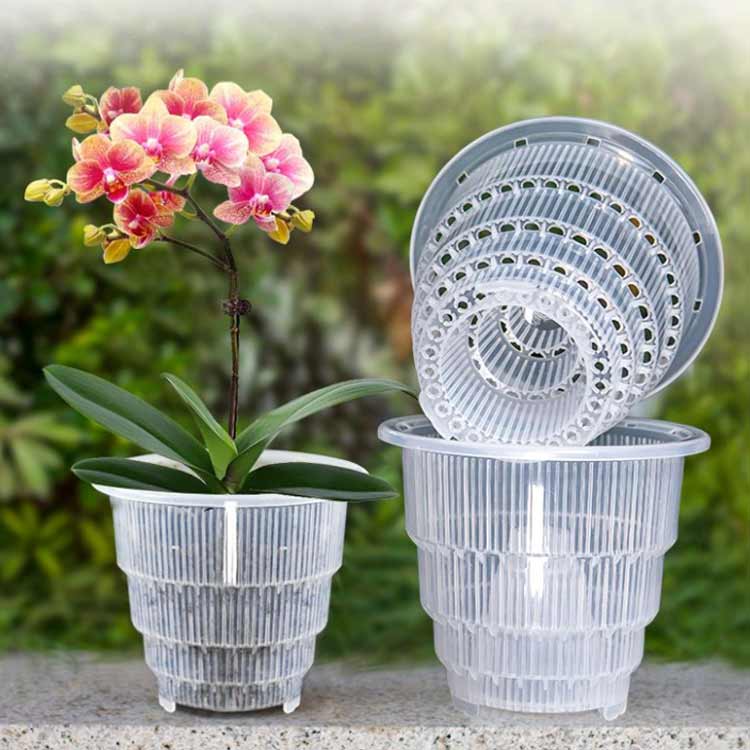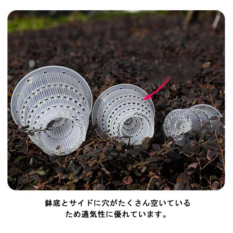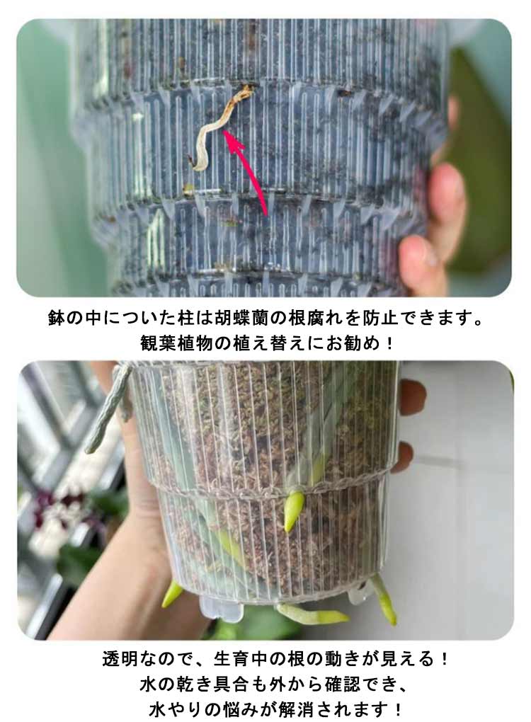 | 【胡蝶蘭専用植木鉢 3鉢セット】 【水がよく抜ける多穴型】【透明鉢と受皿セット】 鉢底とサイドに穴がたくさん空いているため通気性に優れています。 鉢の中についた柱は胡蝶蘭の根腐れを防止できます。観葉植物の植え替えにお勧め! 透明なので、生育中の根の動きが見える!水の乾き具合も外から確認でき、水やりの悩みが解消されます! 胡蝶蘭だけでなく、多肉植物、アデニウムなど観葉植物の植え替えにもお勧め! | |
