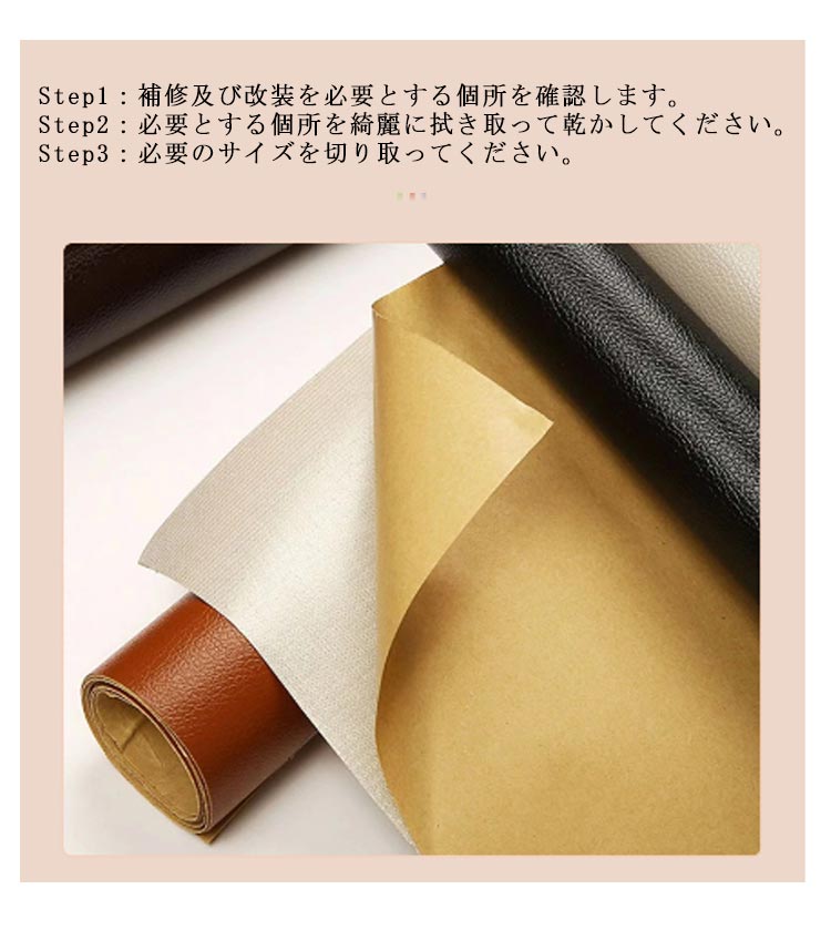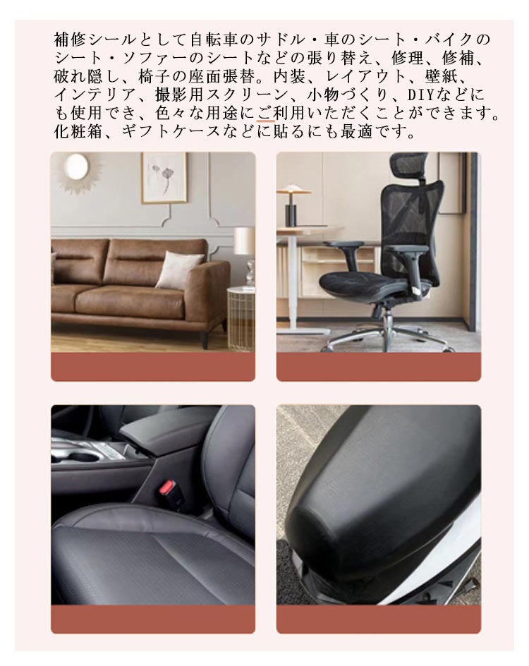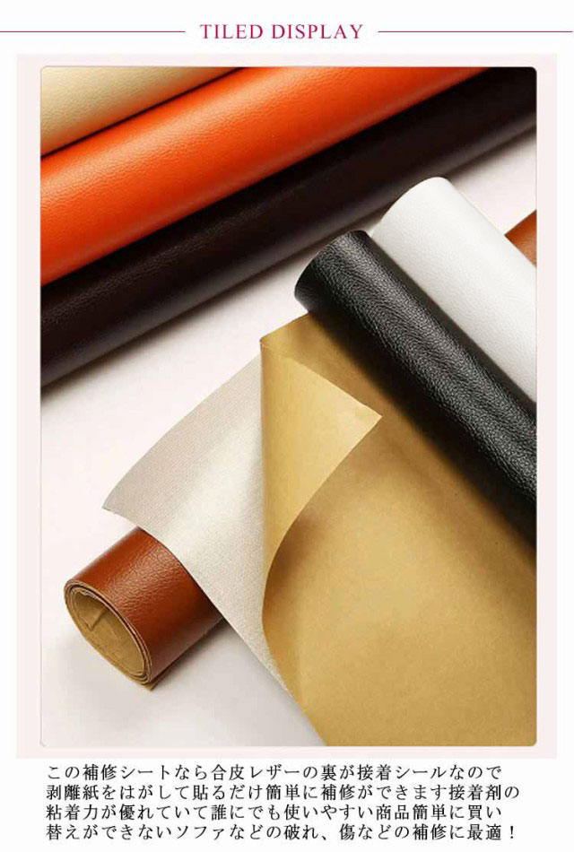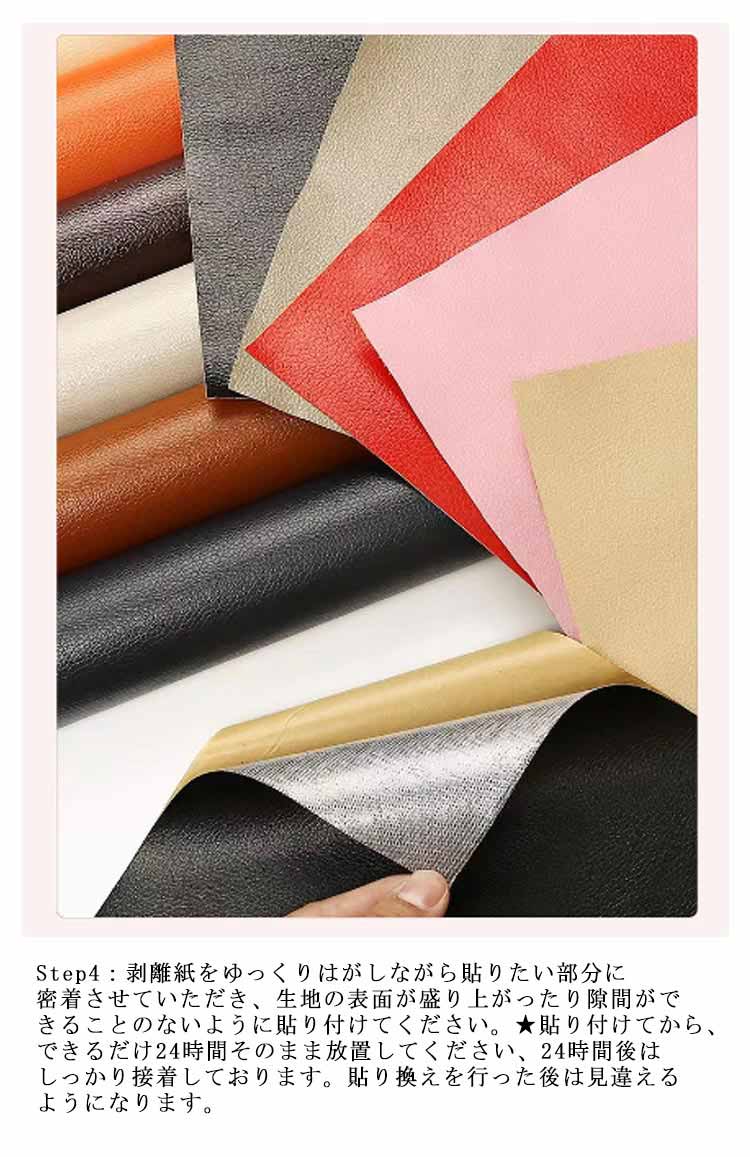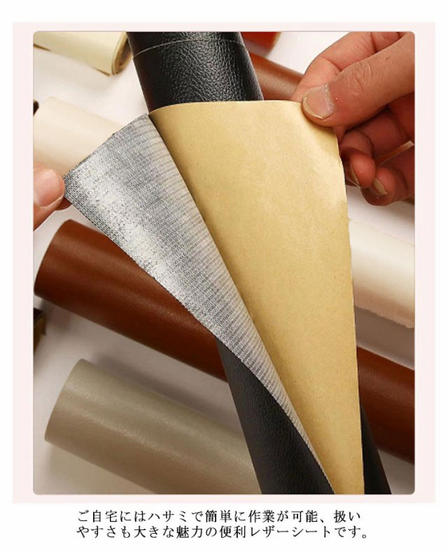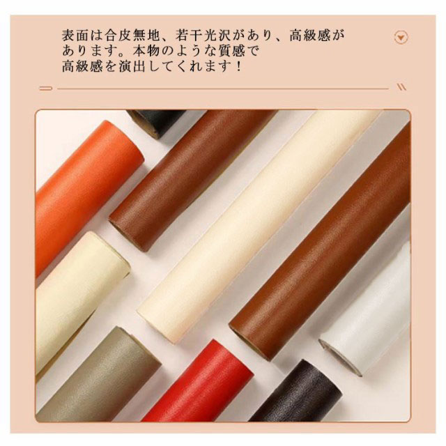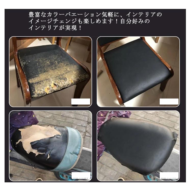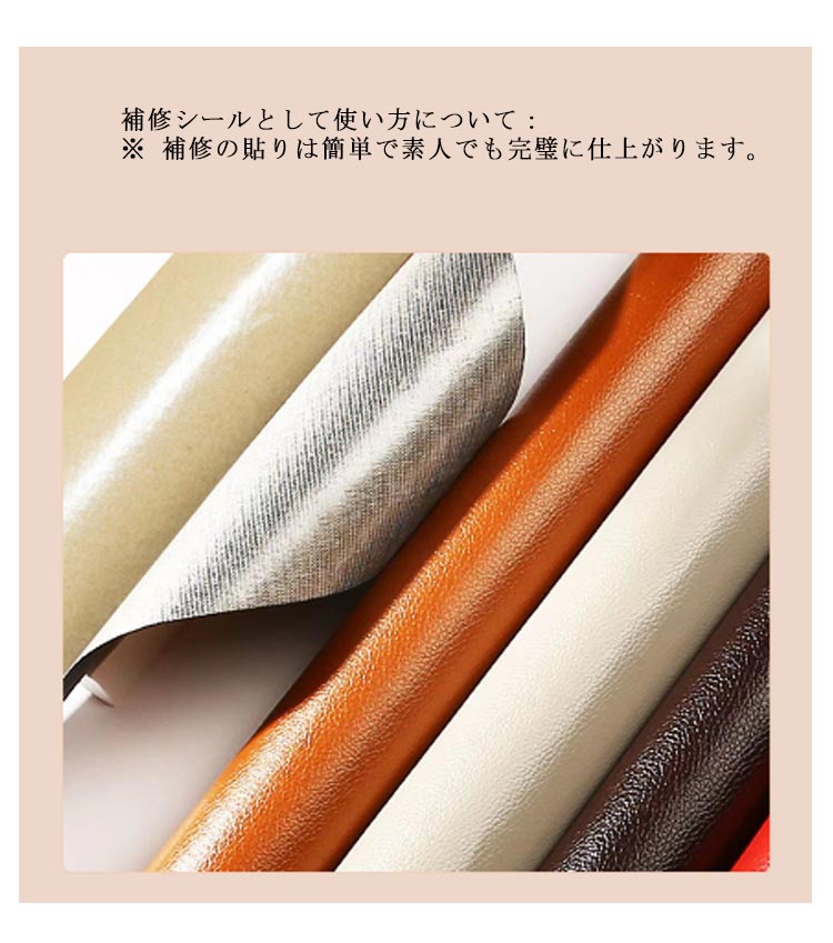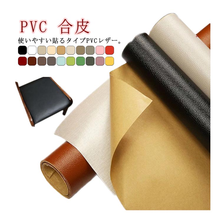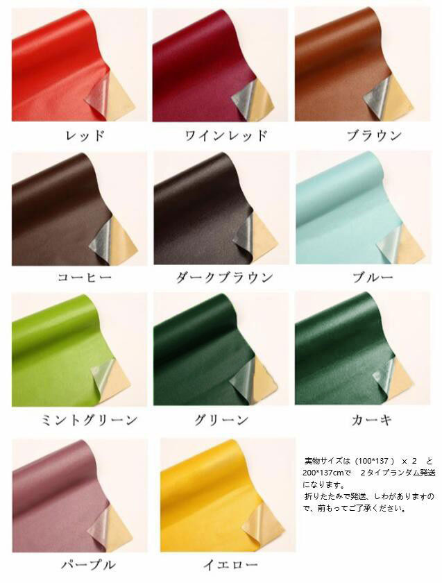 全20色!使いやすい貼るタイプPVCレザー。【200×137cm】【厚さ0.8mm】この補修シートなら合皮レザーの裏が接着シールなので剥離紙をはがして貼るだけ簡単に補修ができます接着剤の粘着力が優れていて誰にでも使いやすい商品簡単に買い替えができないソファなどの破れ、傷などの補修に最適!表面は合皮無地、若干光沢があり、高級感があります。本物のような質感で高級感を演出してくれます!ご自宅にはハサミで簡単に作業が可能、扱いやすさも大きな魅力の便利レザーシートです。豊富なカラーバエーション気軽に、インテリアのイメージチェンジも楽しめます!自分好みのインテリアが実現!【用途】:補修シールとして自転車のサドル・車のシート・バイクのシート・ソファーのシートなどの張り替え、修理、修補、破れ隠し、椅子の座面張替。内装、レイアウト、壁紙、インテリア、撮影用スクリーン、小物づくり、DIYなどにも使用でき、色々な用途にご利用いただくことができます。化粧箱、ギフトケースなどに貼るにも最適です。補修シールとして使い方について:※ 補修の貼りは簡単で素人でも完璧に仕上がります。Step1:補修及び改装を必要とする個所を確認します。Step2:必要とする個所を綺麗に拭き取って乾かしてください。Step3:必要のサイズを切り取ってください。Step4:剥離紙をゆっくりはがしながら貼りたい部分に密着させていただき、生地の表面が盛り上がったり隙間ができることのないように貼り付けてください。★貼り付けてから、できるだけ24時間そのまま放置してください、24時間後はしっかり接着しております。貼り換えを行った後は見違えるようになります。