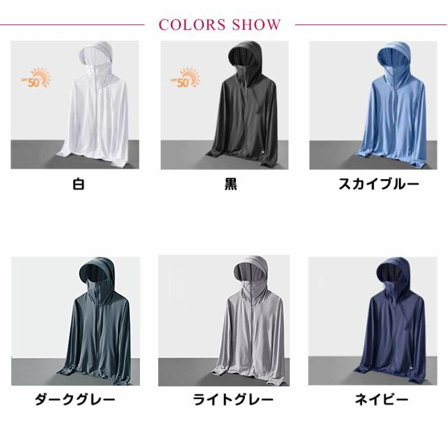 | 冷感生地を使用!伸縮性がある生地のため、ストレスなく着用できます。 UVカット性能の最高ランクUPF50+でお肌に有害な紫外線を98%カット!夏の強い日差しから肌を守ります。 吸汗速乾性、吸放湿性に優れている高機能性冷感生地を使用、日差しが強い真夏でもサラサラの着心地です。 指穴付きになったデザインで、手の甲までしっかり覆えるのがポイントです。 大きめのツバ付き、幅広いサンバイザーで頭から顔までフェイス、首周りをガード。 鼻先まで付いたファスナーを上まで閉じれば顔をすっぽり覆うことができる。 | |