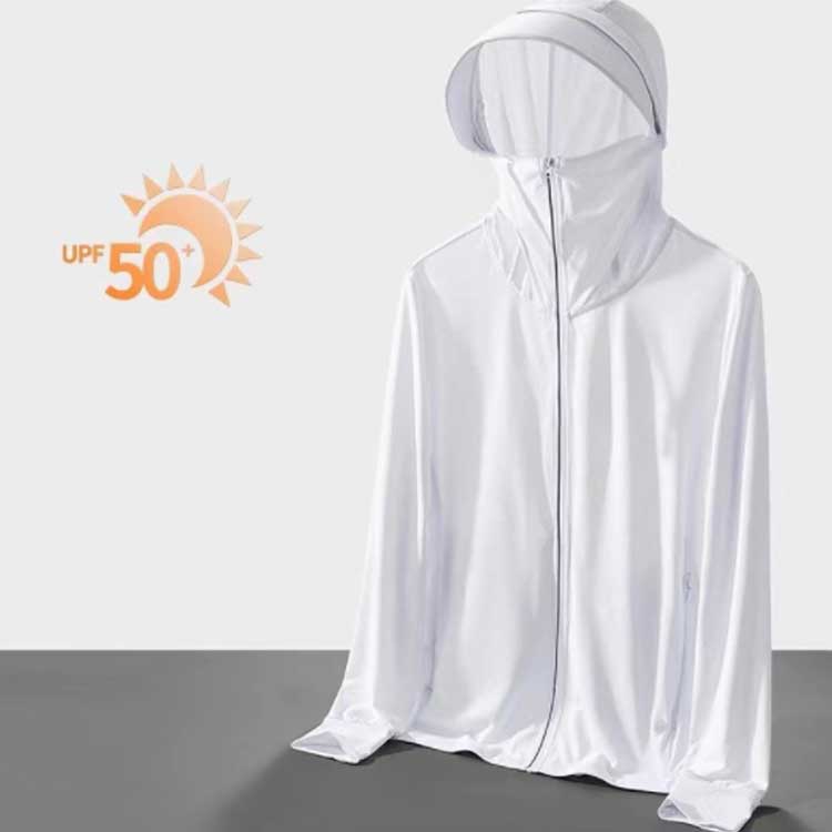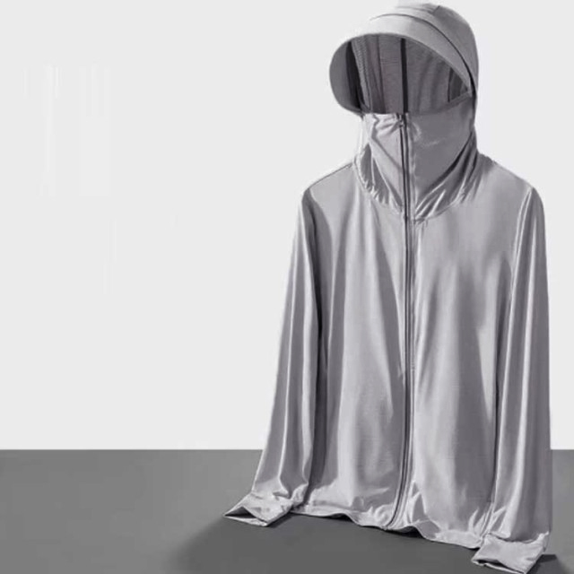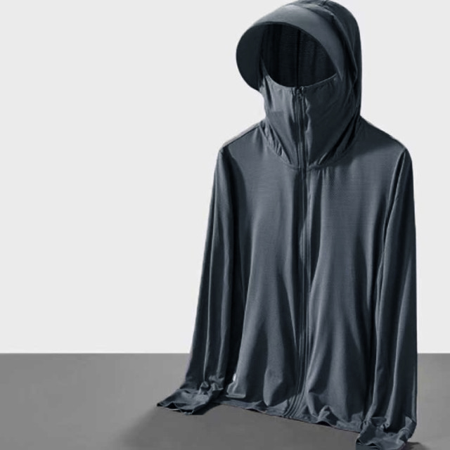 冷感生地を使用!伸縮性がある生地のため、ストレスなく着用できます。UVカット性能の最高ランクUPF50+でお肌に有害な紫外線を98%カット!夏の強い日差しから肌を守ります。吸汗速乾性、吸放湿性に優れている高機能性冷感生地を使用、日差しが強い真夏でもサラサラの着心地です。指穴付きになったデザインで、手の甲までしっかり覆えるのがポイントです。大きめのツバ付き、幅広いサンバイザーで頭から顔までフェイス、首周りをガード。鼻先まで付いたファスナーを上まで閉じれば顔をすっぽり覆うことができる。