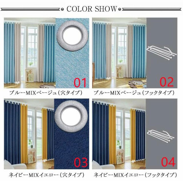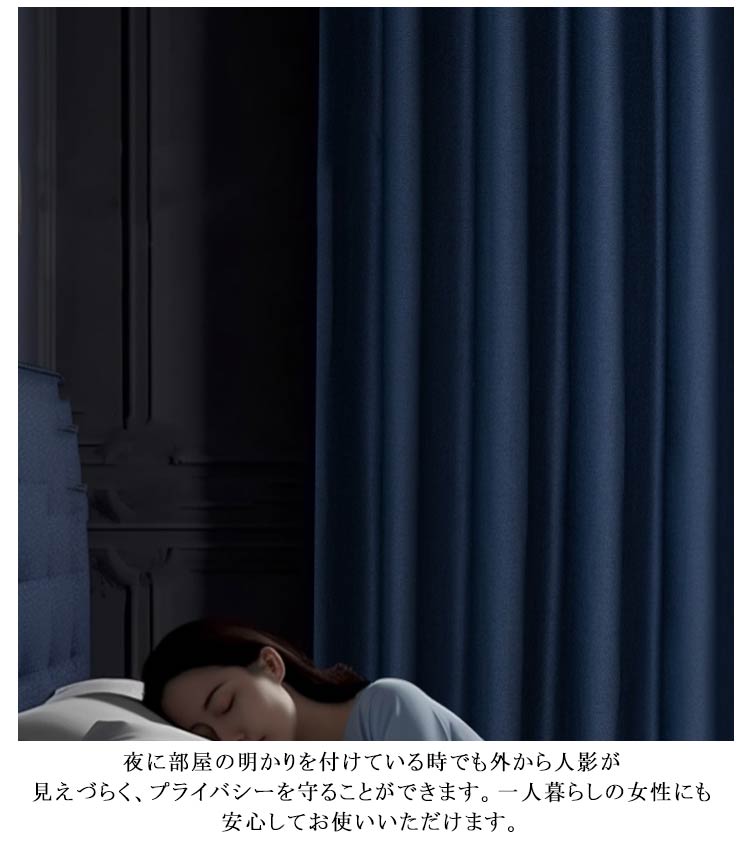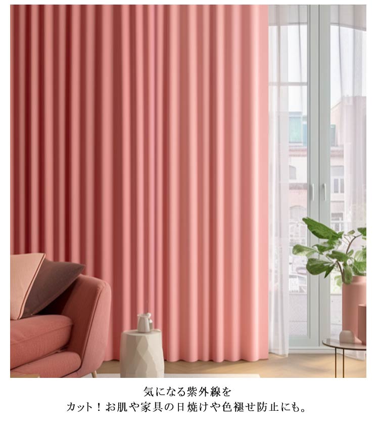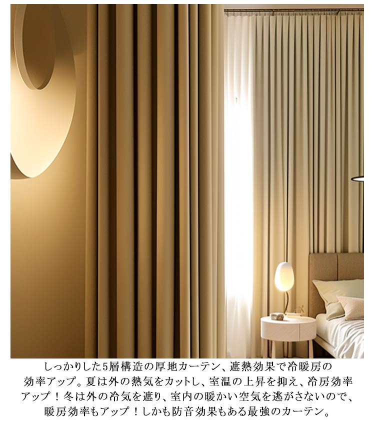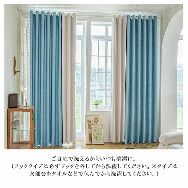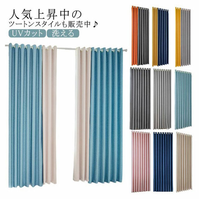 人気上昇中のツートンスタイルも販売中♪重厚感がなりがちな遮光カーテンも配色設計でお部屋の印象を決めるお洒落なツートンスタイルも展開。1級遮光カーテンは日差しもしっかりと遮光できるので、光をできる限りシャットアウトしたい方にお勧め。夜に部屋の明かりを付けている時でも外から人影が見えづらく、プライバシーを守ることができます。一人暮らしの女性にも安心してお使いいただけます。気になる紫外線をカット!お肌や家具の日焼けや色褪せ防止にも。しっかりした5層構造の厚地カーテン、遮熱効果で冷暖房の効率アップ。夏は外の熱気をカットし、室温の上昇を抑え、冷房効率アップ!冬は外の冷気を遮り、室内の暖かい空気を逃がさないので、暖房効率もアップ!しかも防音効果もある最強のカーテン。ご自宅で洗えるからいつも清潔に。(フックタイプは必ずフックを外してから洗濯してください。穴タイプは穴部分をタオルなどで包んでから洗濯してください。)