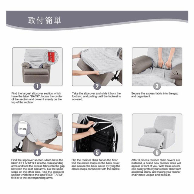 【2人掛け (6点セット)】【優れている弾力性】【収納ポケットがある】【手洗いも洗濯機もOK】【ゴム仕様でズレ防止】柔らかさと弾力性が優れている素材で、 ソファーをしっかり包み込んで、いくら動いても 変形しにくいです。側面に収納ポケットが備え、程よい大きさで、普段読んでいる雑誌、 スマホやリクライニングのリモコンなどを収納することは可能です。手洗いはもちろん、洗濯機にも対応可能です。 お手入れ簡単でいつでも清潔に!カバー本体はゴム仕様で、ソファーにしっかり固定します。 更に固定用ゴムバンドは設置し、 すべり止めに効果的に!