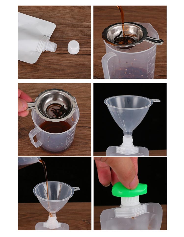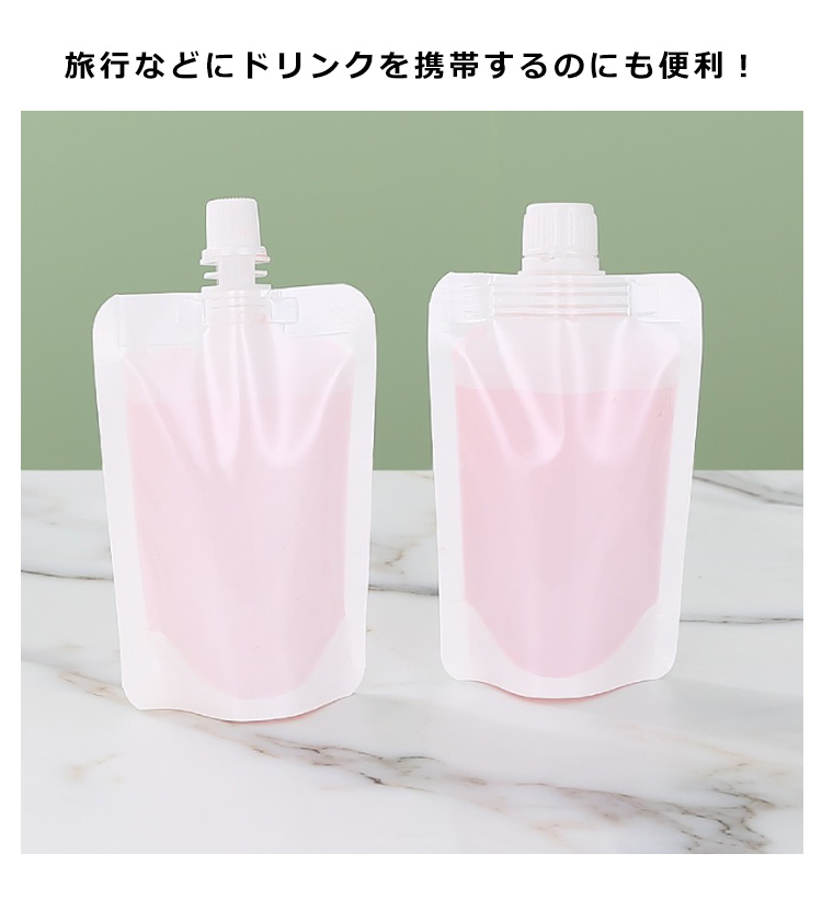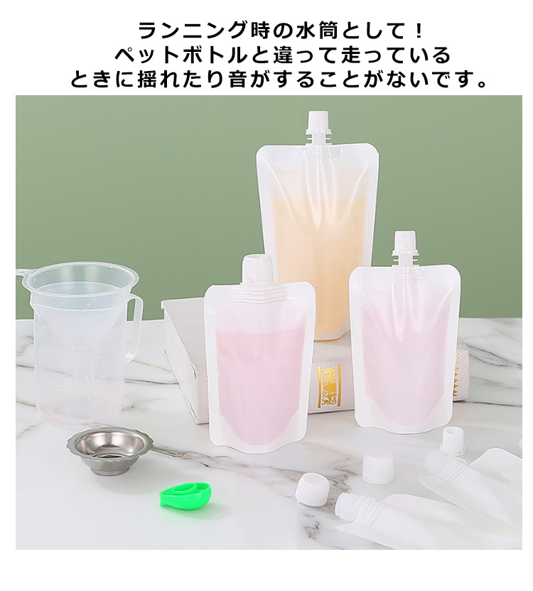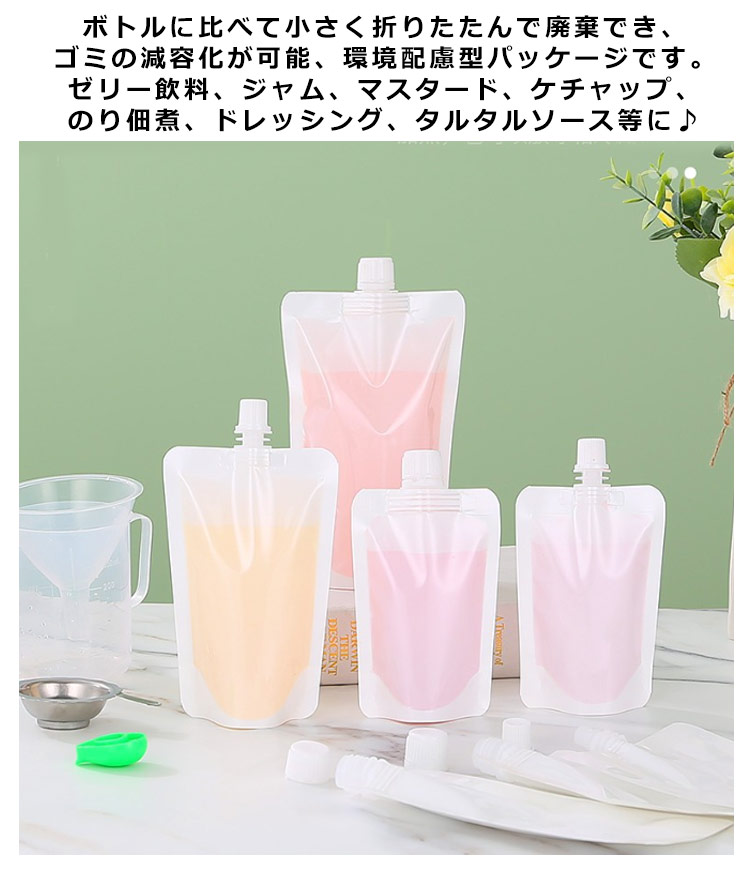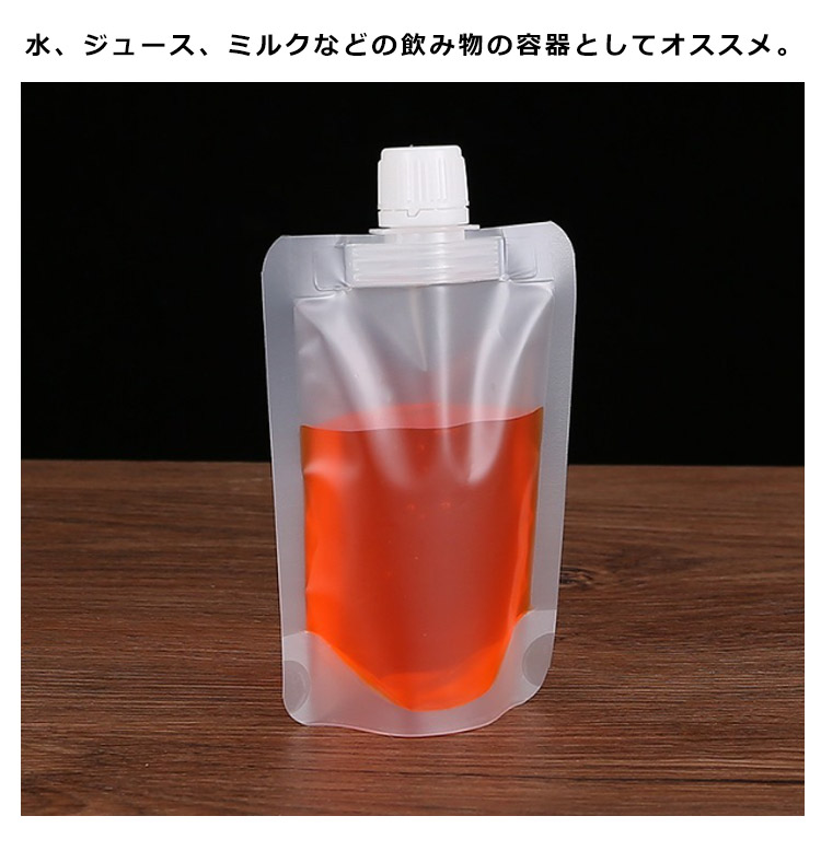 飲み口広々!スパウトパウチの容器100個セットです。開封した事が分かるバージンキャップ付き♪温&冷OK!沸騰した100度のお湯で湯煎できます。冷凍庫保存ok!-20度にも耐えれます。お店で自家製ドリンク等を販売、クリアの容器ですのでお店のシールを貼ると一層魅力的な商品になります。ランニング時の水筒として!ペットボトルと違って走っているときに揺れたり音がすることがないです。ボトルに比べて小さく折りたたんで廃棄でき、ゴミの減容化が可能、環境配慮型パッケージです。ゼリー飲料、ジャム、マスタード、ケチャップ、のり佃煮、ドレッシング、タルタルソース等に♪水、ジュース、ミルクなどの飲み物の容器としてオススメ。注む用具が付き、液体を簡単に注入できます。キャップでしっかり密封すると漏れる心配がないんです。旅行などにドリンクを携帯するのにも便利!
