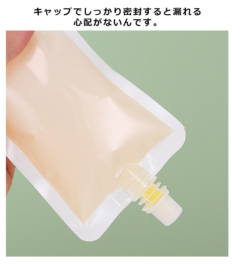 | 飲み口広々!スパウトパウチの容器100個セットです。開封した事が分かるバージンキャップ付き? 温&冷OK!沸騰した100度のお湯で湯煎できます。冷凍庫保存ok!-20度にも耐えれます。 お店で自家製ドリンク等を販売、クリアの容器ですのでお店のシールを貼ると一層魅力的な商品になります。 ランニング時の水筒として!ペットボトルと違って走っているときに揺れたり音がすることがないです。 ボトルに比べて小さく折りたたんで廃棄でき、ゴミの減容化が可能、環境配慮型パッケージです。ゼリー飲料、ジャム、マスタード、ケチャップ、のり佃煮、ドレッシング、タルタルソース等に? 水、ジュース、ミルクなどの飲み物の容器としてオススメ。 注む用具が付き、液体を簡単に注入できます。 キャップでしっかり密封すると漏れる心配がないんです。 旅行などにドリンクを携帯するのにも便利! | |