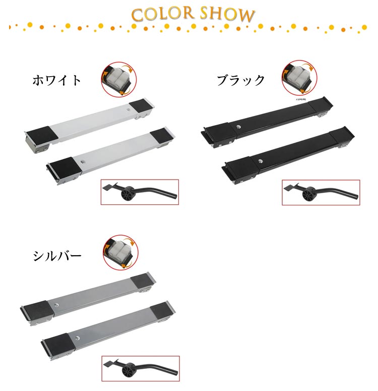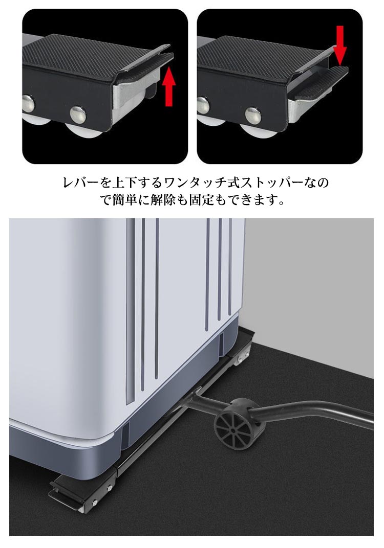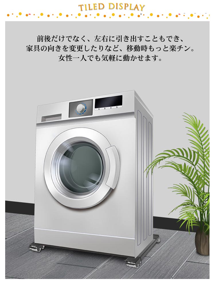| キャスターが360度回転できる最新モデル。 前後だけでなく、左右に引き出すこともでき、家具の向きを変更したりなど、移動時もっと楽チン。女性一人でも気軽に動かせます。 設置するだけで洗濯機や冷蔵庫周りや下の掃除がラクラク?防振パッド付きで洗濯時の音も小さくなります。 耐荷重300KGまでから、重たいトラム式洗濯機も安心。 約4cmの高さ、安定性が高く、掃除もしやすく、防水性も高いです。かさ上げをすることで、排水ホース周りの問題も活躍。 レバーを上下するワンタッチ式ストッパーなので簡単に解除も固定もできます。 スリムな設計で見た目がスッキリ、インテリアの邪魔にもなりません。 | |