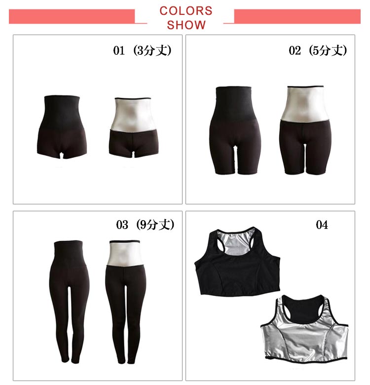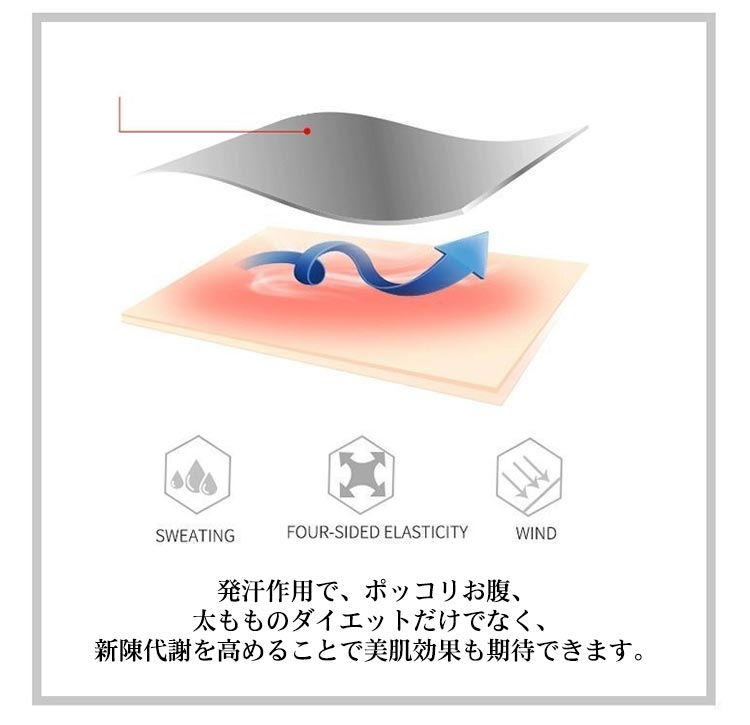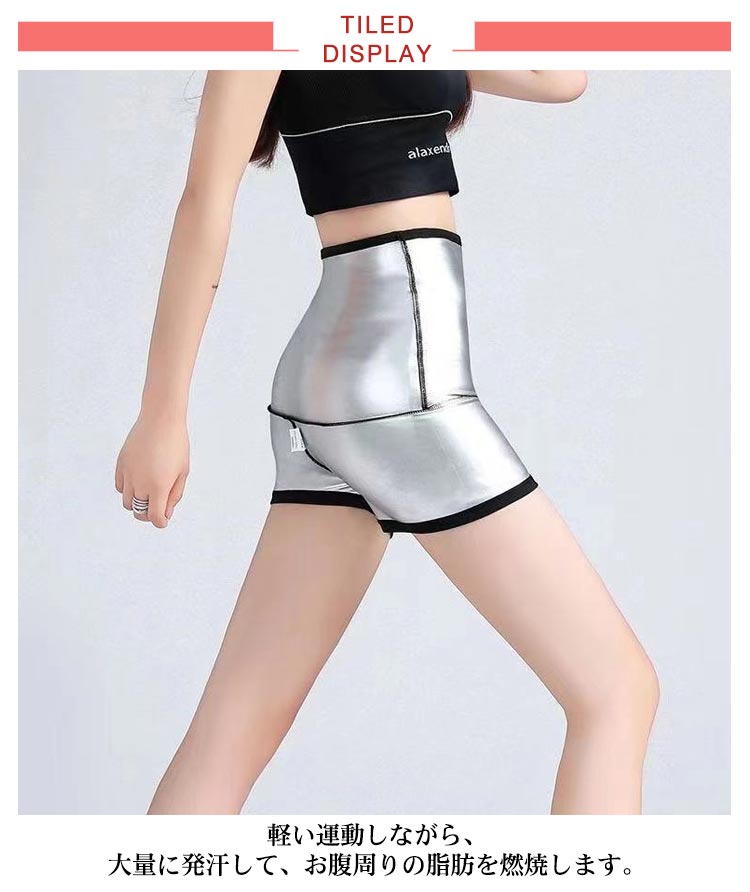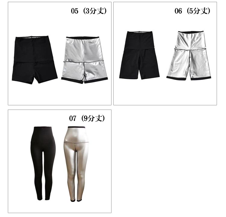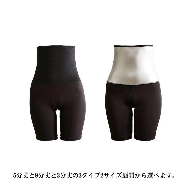 | オシャレなサウナスーツ。ダイエットや代謝UPに最適?運動効率UPで発汗促進! 軽い運動しながら、大量に発汗して、お腹周りの脂肪を燃焼します。 発汗作用で、ポッコリお腹、太もものダイエットだけでなく、新陳代謝を高めることで美肌効果も期待できます。 ジョギング、ウォーキング、ヨガなど、フィットネスとスポーツに活躍できます。 5分丈と9分丈と3分丈の3タイプ2サイズ展開から選べます。 | |