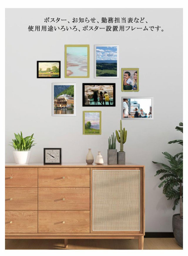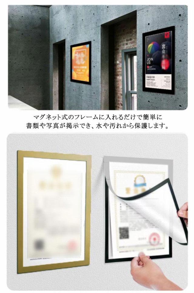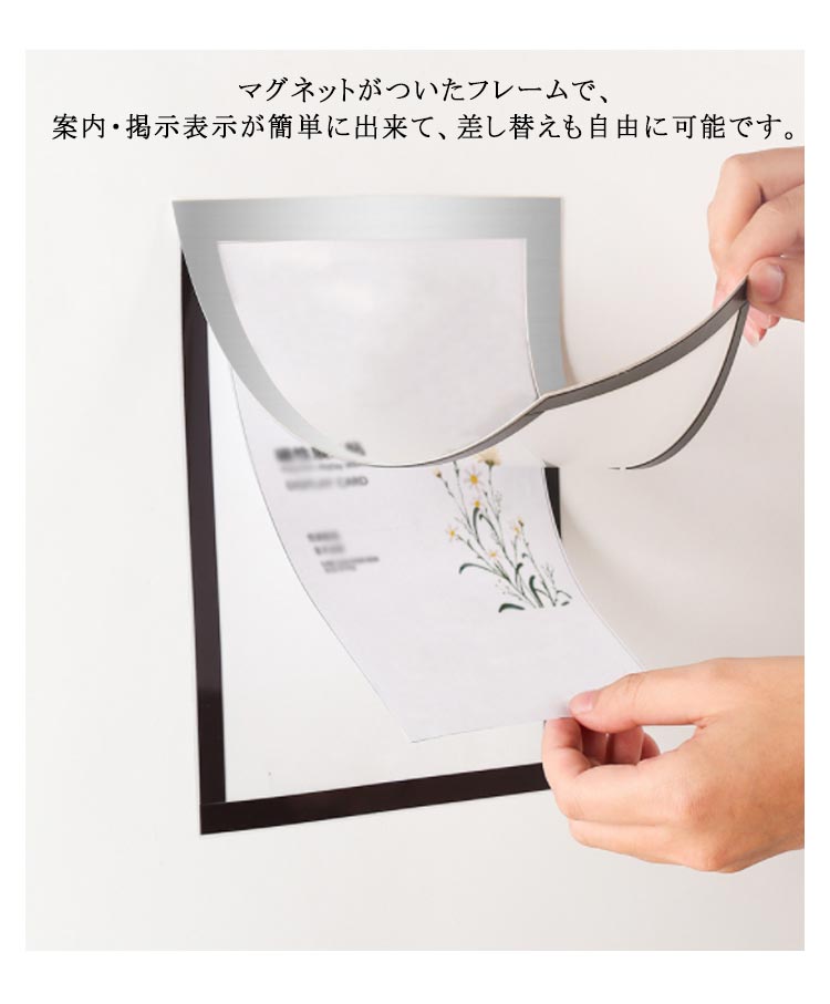 ・ポスターやお知らせの掲示に役立つ『マグネットフレーム』・マグネットがついたフレームで、案内・掲示表示が簡単に出来て、差し替えも自由に可能です。・マグネット式のフレームに入れるだけで簡単に書類や写真が掲示でき、水や汚れから保護します。・高透明で書類が綺麗に見えます。・貼ったまま中身の交換がしやすい3辺マグネット。・ポスター、お知らせ、勤務担当表など、使用用途いろいろ、ポスター設置用フレームです。※壁へは両面テープで貼り付ける仕様となっておりますので、移動をする可能性がある場合は 商品の両面テープを使用せず、はがせる両面テープや魔法のテープ等をご使用ください。