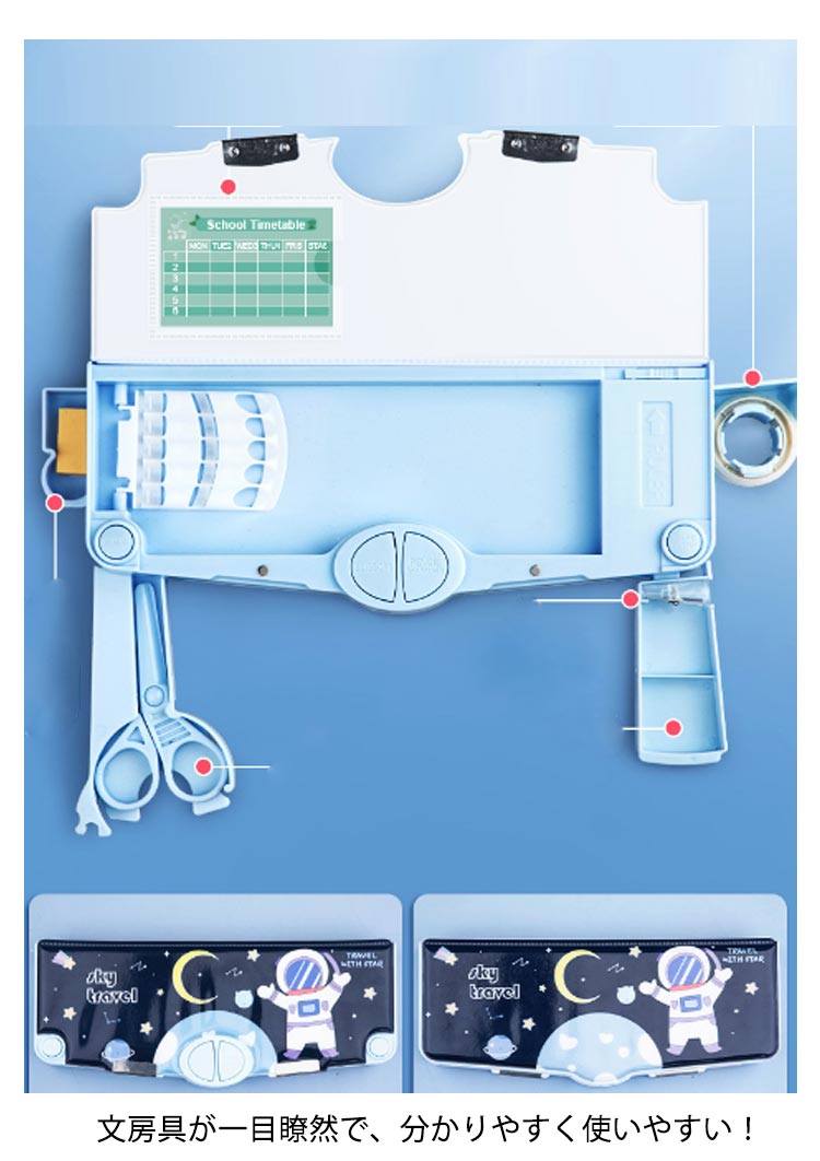 | 機能性はバッチリなので大活躍間違いなし。 時間割表+消しゴムケース+ハサミ付き+鉛筆削り+鉛筆ホルダー(鉛筆5本を収納)+テープ収納! 大容量でテーブルの上で散らばりそうな小物も、一気におしゃれに片付きます。 文房具が一目瞭然で、分かりやすく使いやすい! | |
