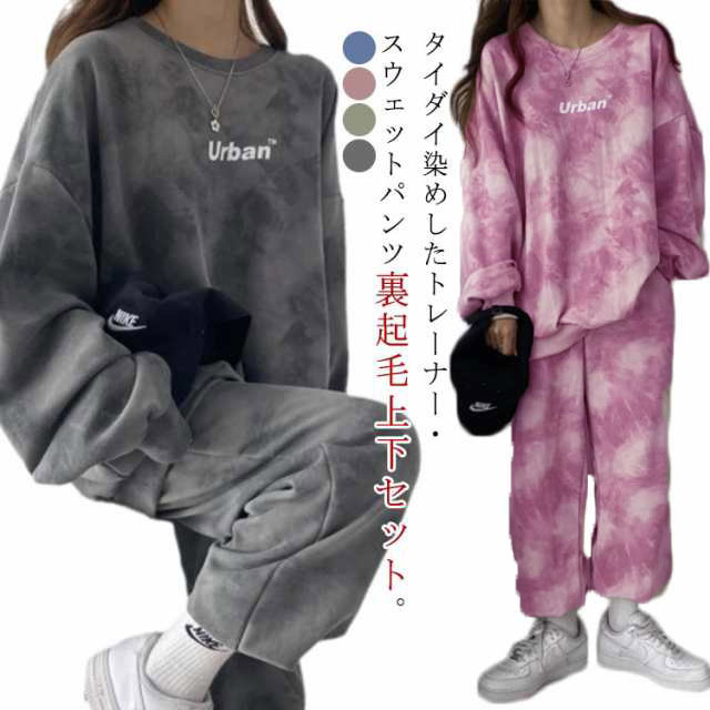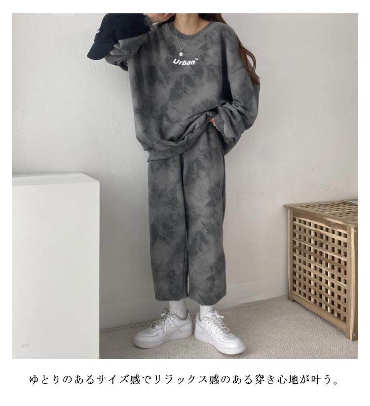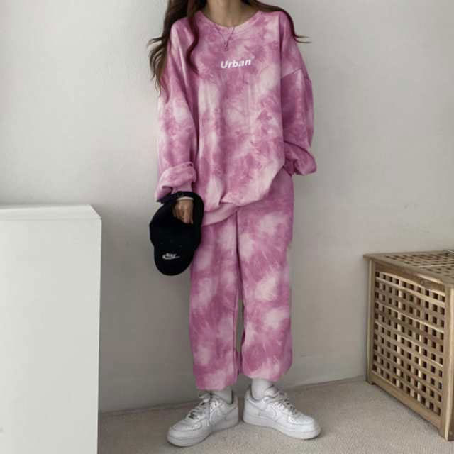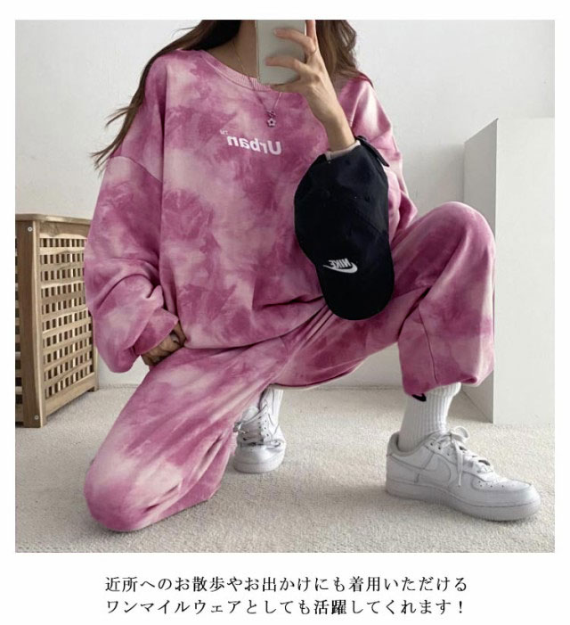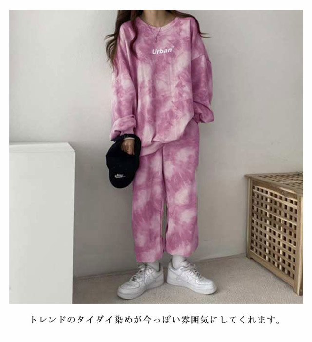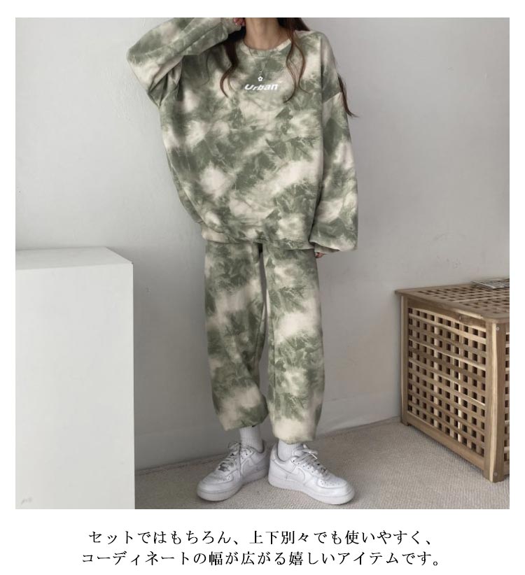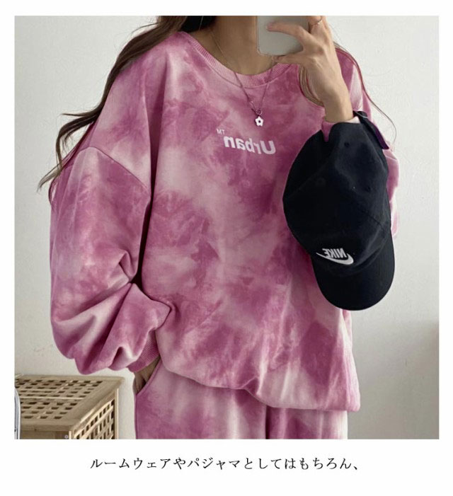 タイダイ染めしたトレーナー・スウェットパンツ裏起毛上下セット。ゆとりのあるサイズ感でリラックス感のある穿き心地が叶う。トレンドのタイダイ染めが今っぽい雰囲気にしてくれます。ルームウェアやパジャマとしてはもちろん、近所へのお散歩やお出かけにも着用いただけるワンマイルウェアとしても活躍してくれます!セットではもちろん、上下別々でも使いやすく、コーディネートの幅が広がる嬉しいアイテムです。