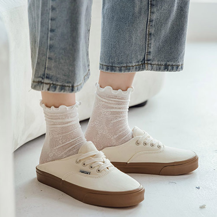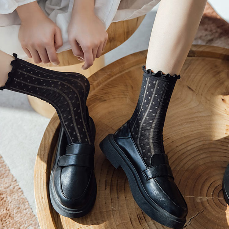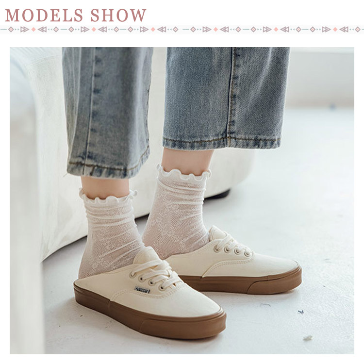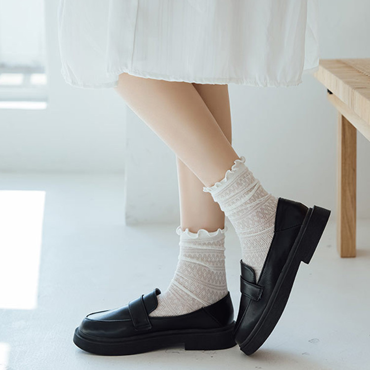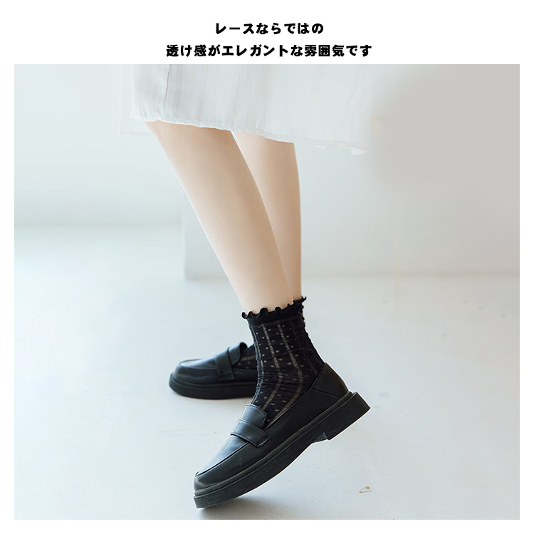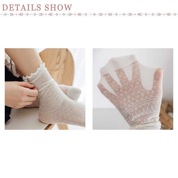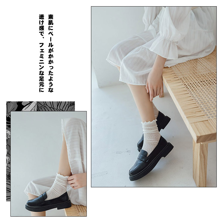 4足組 レース編み風 レディース ソックス 靴下 春夏 フリル シースルー シアー 通気性 エレガント くつ下 ショートソックス おしゃれ ミドル丈 ブラック ホワイト 白 黒 薄い 薄手 かわいい 可愛い 送料無料