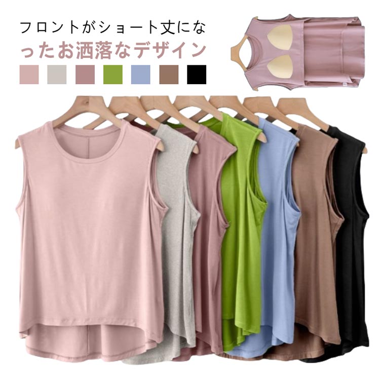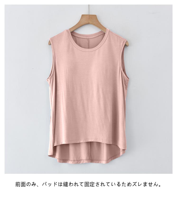 カップ付き タンクトップ アンダーフリー ゴムなし ブラトップ 前のみ パッドのみ 固定 ルームウェア パット付き Tシャツ 袖なし インナー トップス ラウンドネック 丸首 下着 肌着 部屋着 締め付けない ズレない アウターで着れる ナイトブラ 無地 送料無料